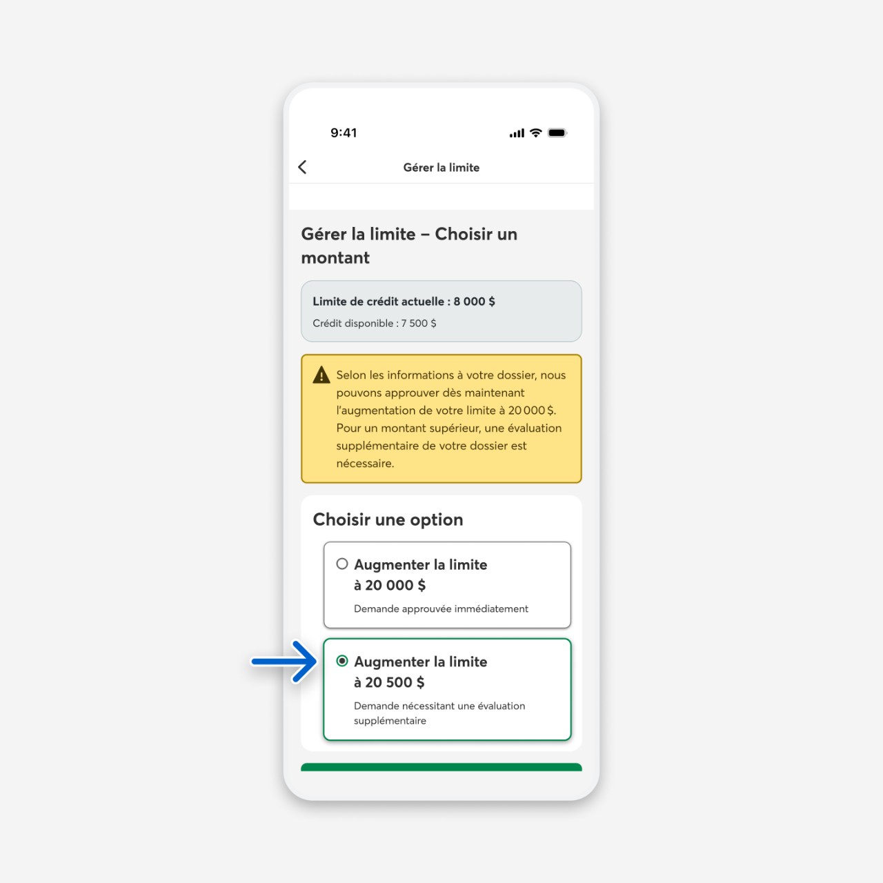 Dans la page Gérer la limite – Choisir un montant, si vous pouvez profiter d’une limite plus élevée, la section Choisir une option apparaît. Vous pouvez sélectionner le montant préapprouvé que nous vous proposons ou un montant supérieur qui nécessite une évaluation supplémentaire.