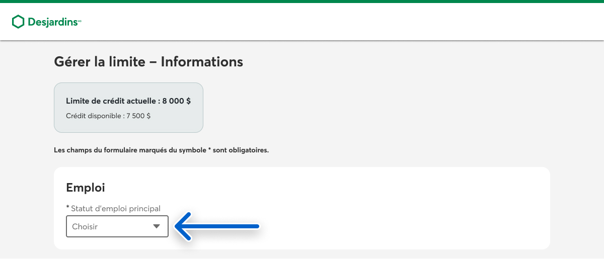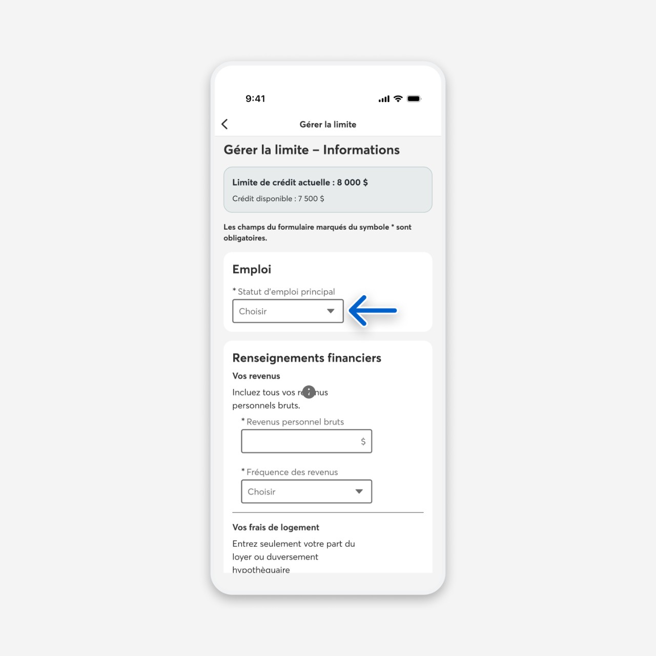 Dans la page Gérer la limite – Informations, sous Emploi, sélectionnez votre statut d’emploi principal dans la liste déroulante.