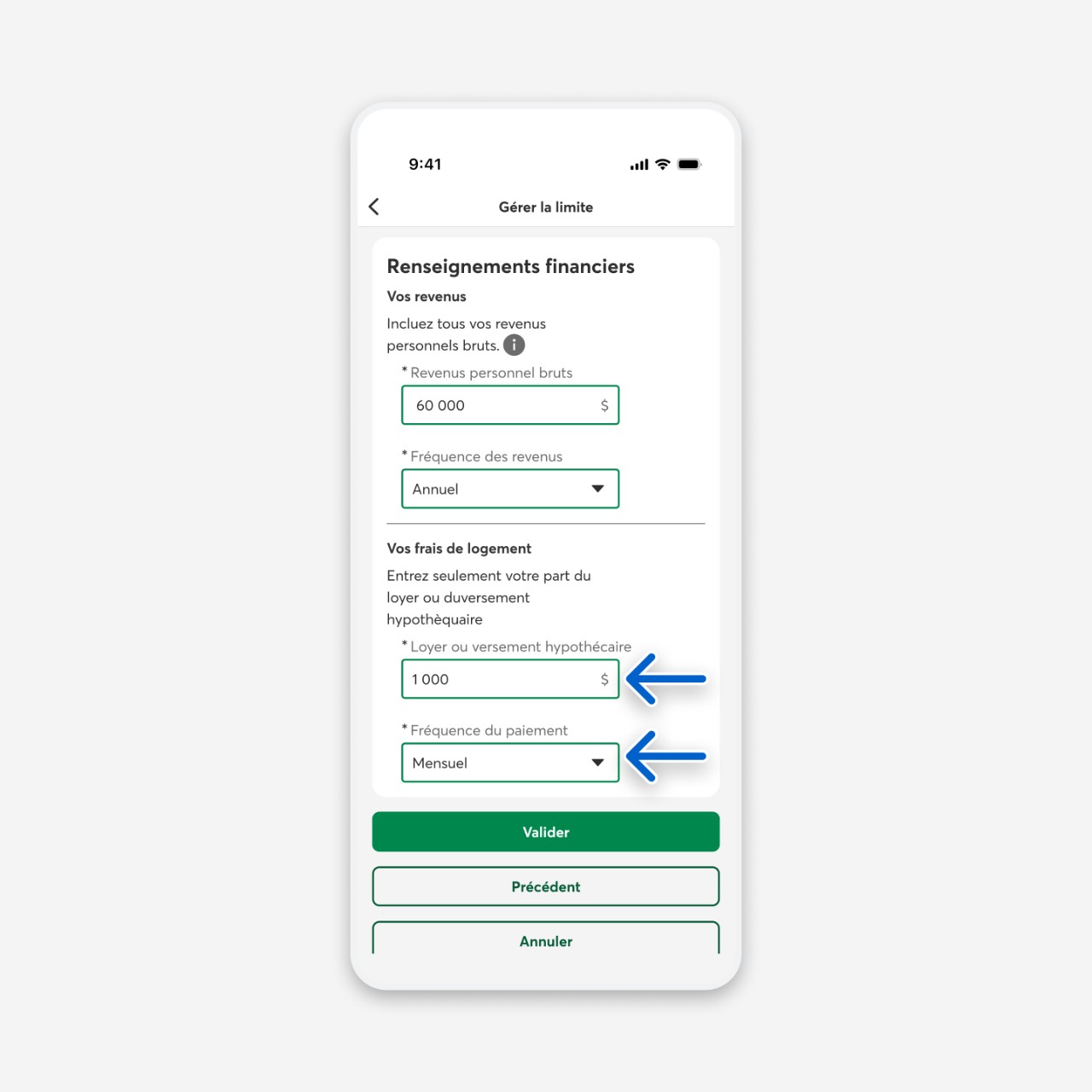 Sous Vos frais de logement, entrez vos informations dans le champ Loyer ou versement hypothécaire, puis indiquez la fréquence du paiement en sélectionnant le bouton de menu.