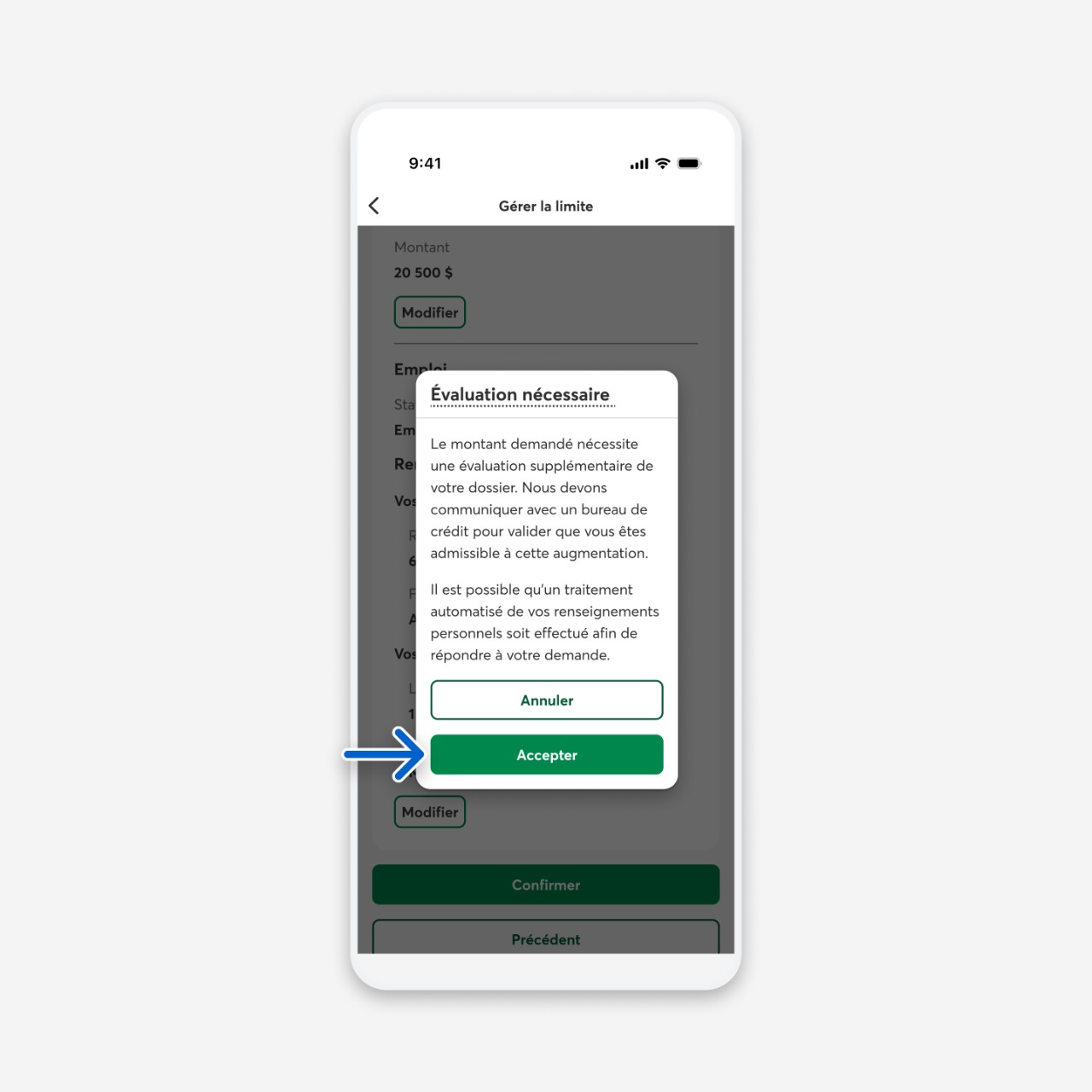 Si votre demande nécessite une évaluation, sélectionnez le bouton Accepter pour nous autoriser à communiquer avec un bureau de crédit.