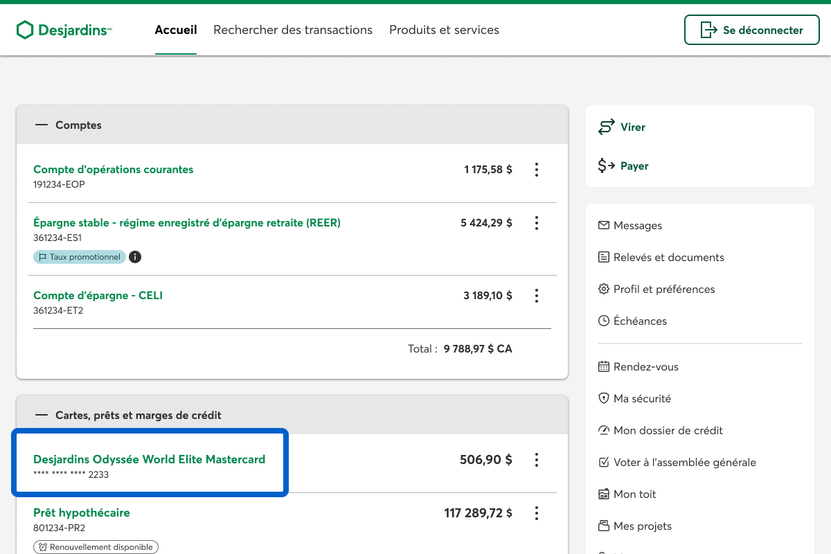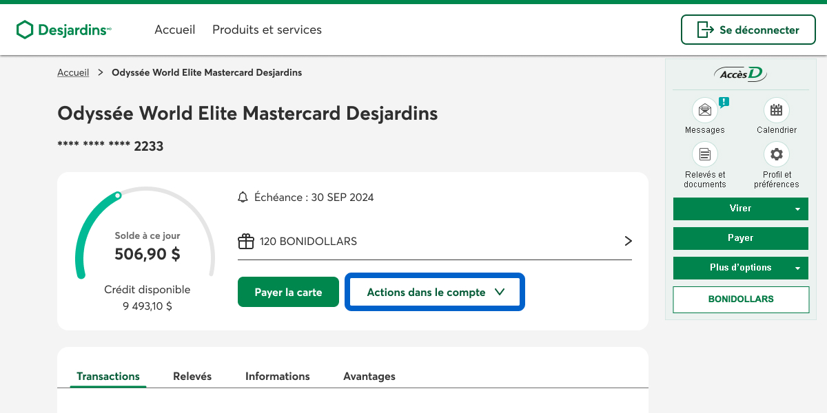 Dans la page d’accueil d’AccèsD, sous Cartes, prêts et marges de crédit, sélectionnez la carte de crédit pour laquelle vous voulez gérer la limite de crédit.