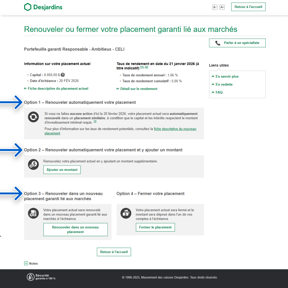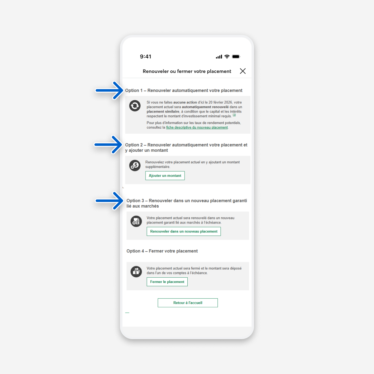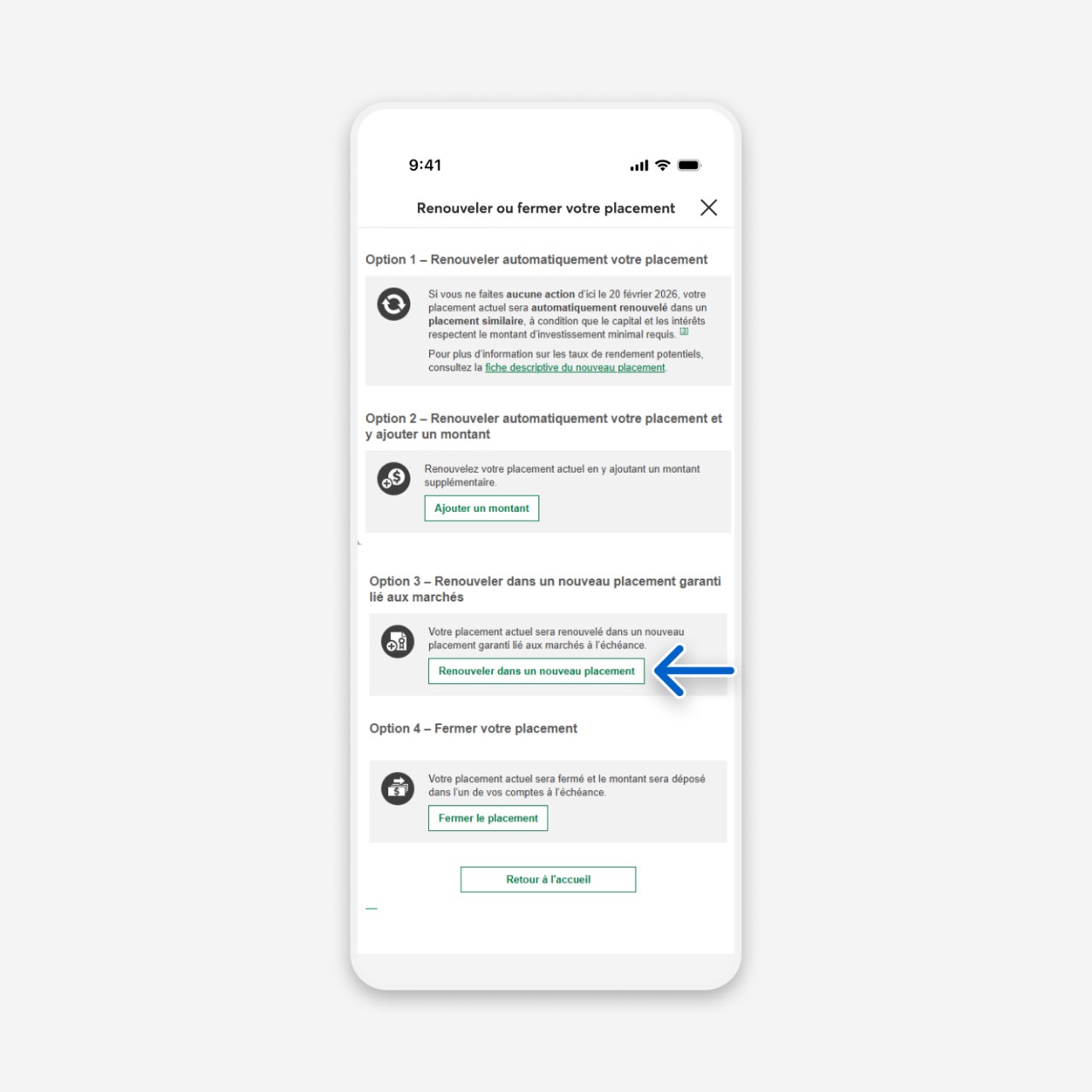 Dans la page Renouveler ou fermer votre placement garanti lié aux marchés, choisissez parmi les options offertes.