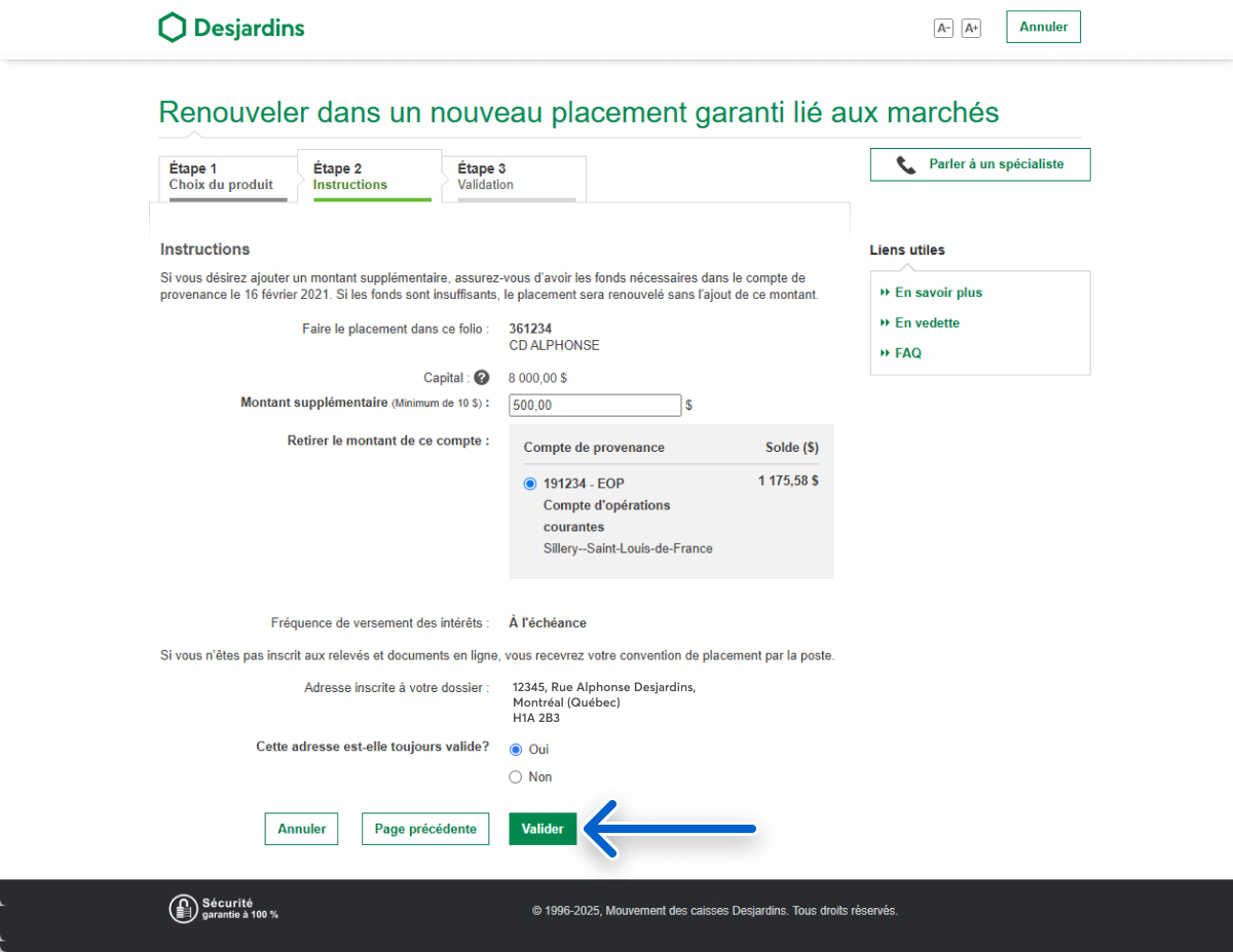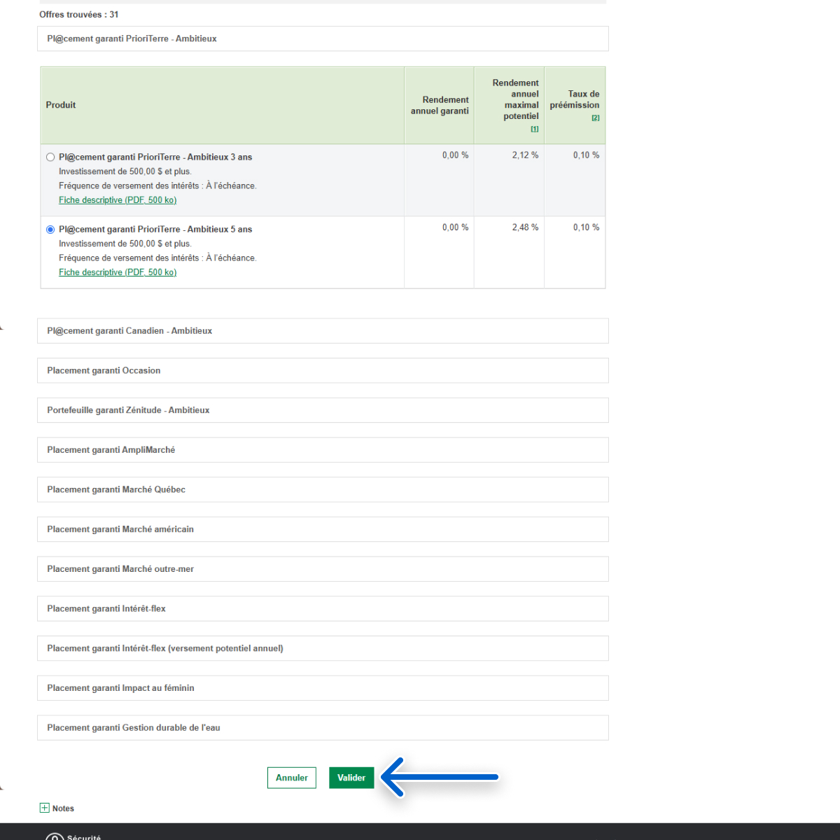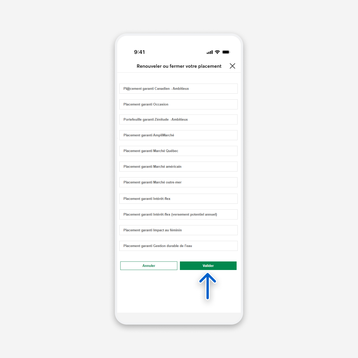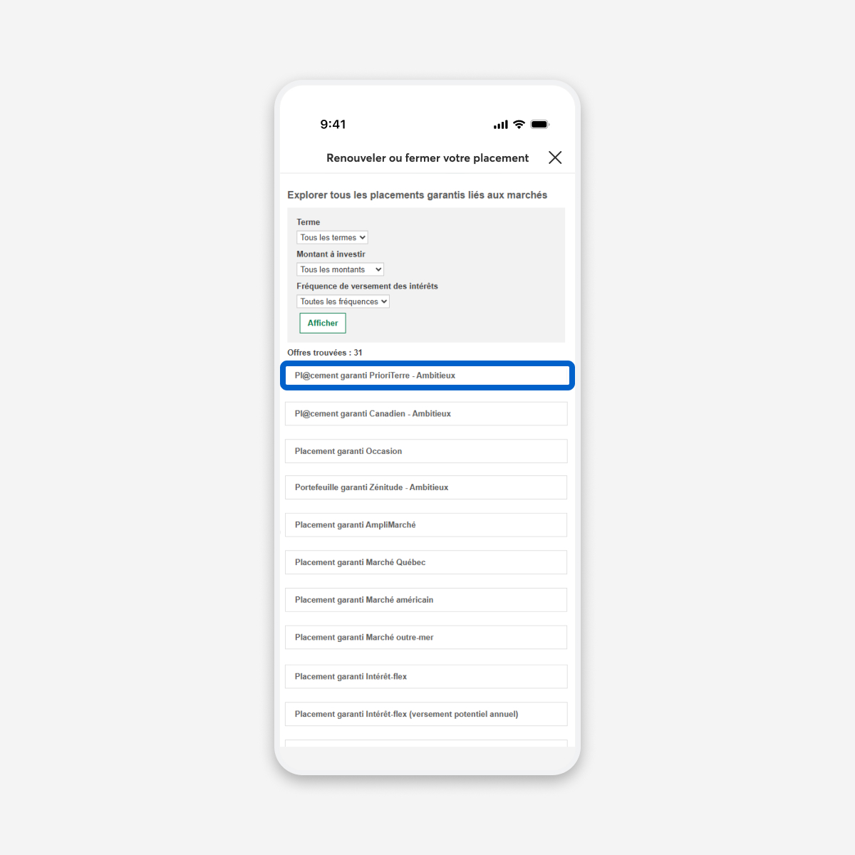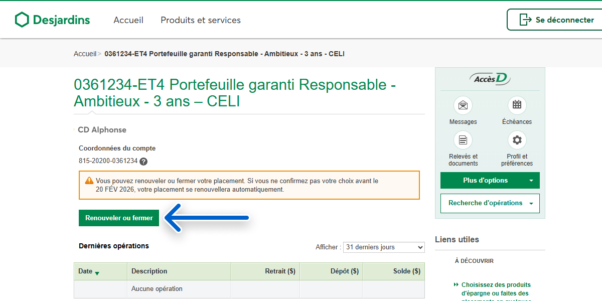 Dans la page d’accueil d’AccèsD, sous Épargne et placements, sélectionnez le placement garanti lié aux marchés que vous voulez renouveler.