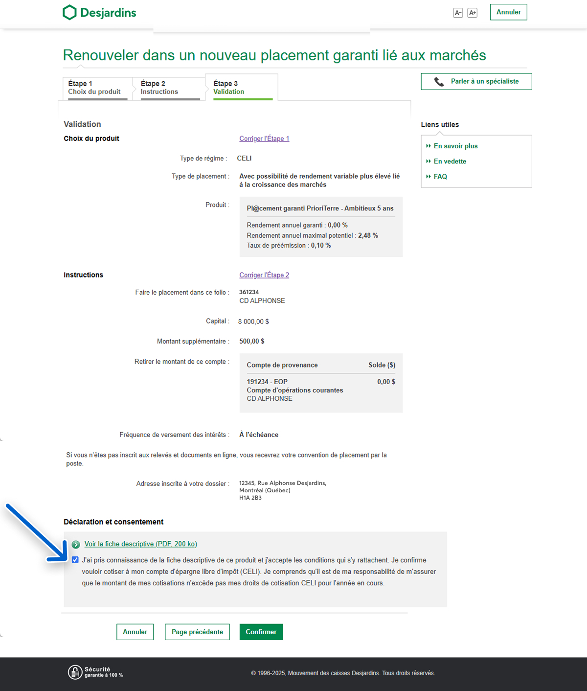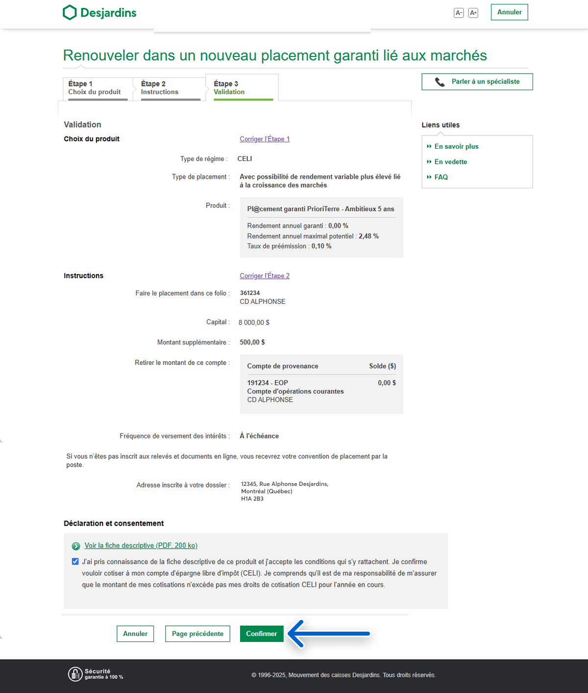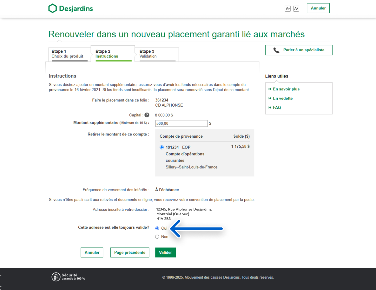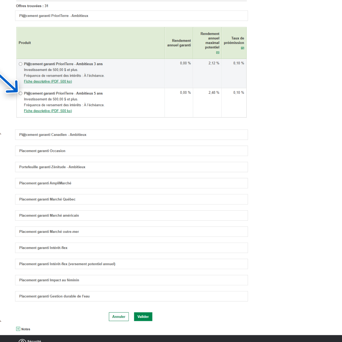 Dans la page d’accueil d’AccèsD, sous Épargne et placements, sélectionnez le placement garanti lié aux marchés que vous voulez renouveler.