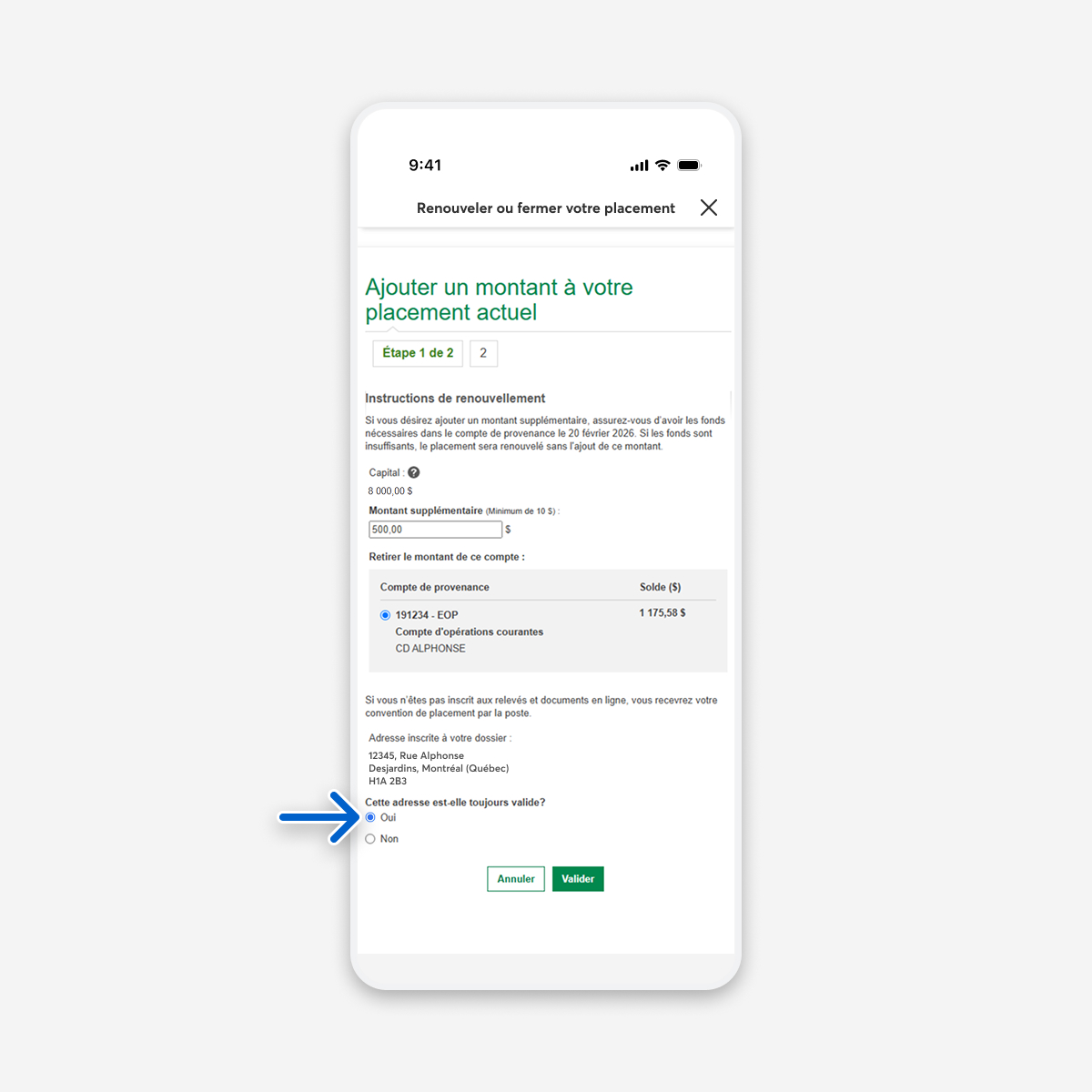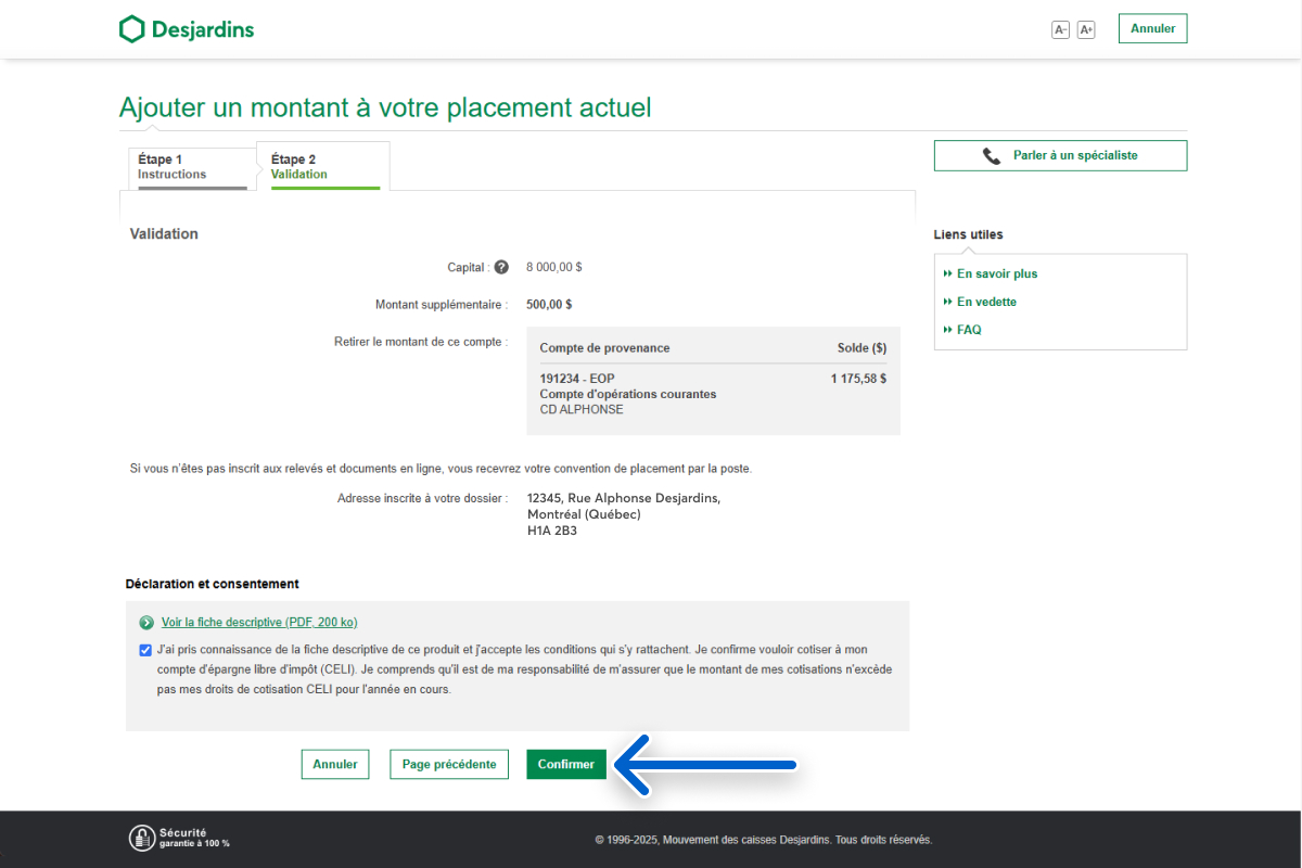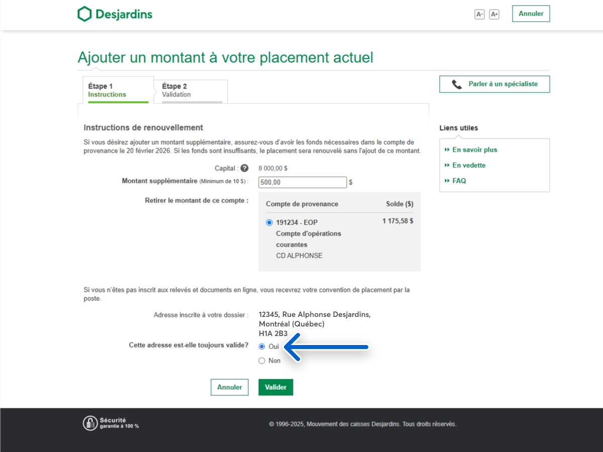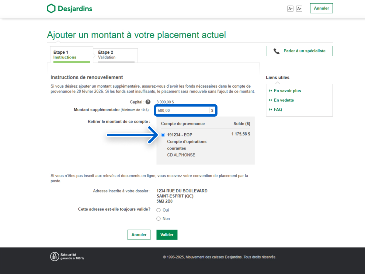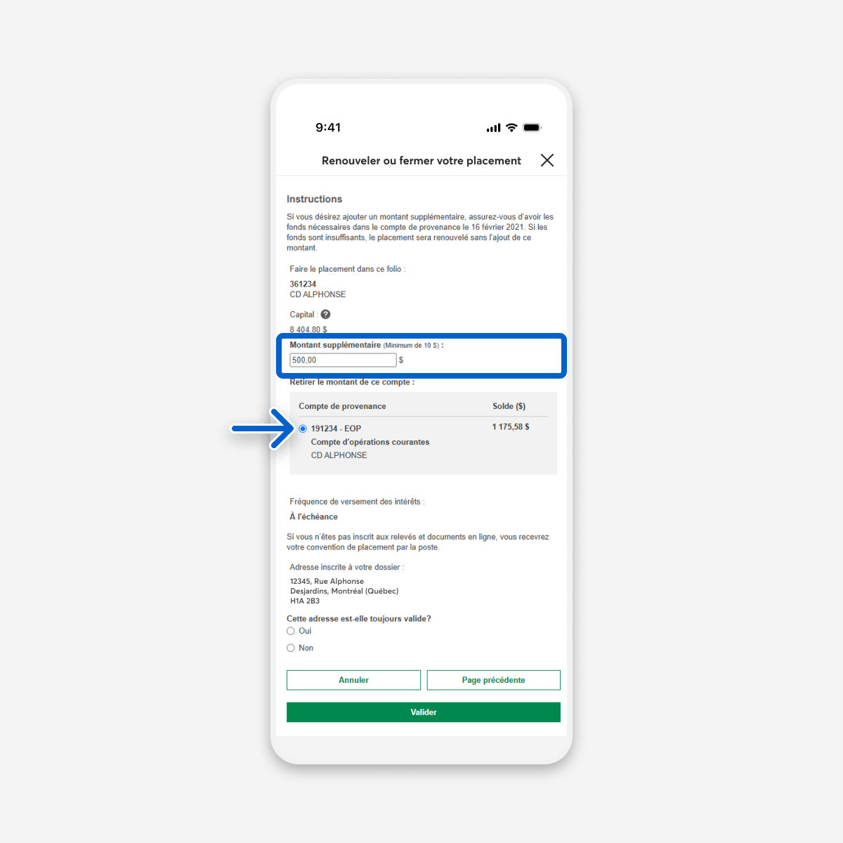 Si vous voulez ajouter un montant à votre placement, entrez-le dans le champ Montant supplémentaire, puis sélectionnez le compte de provenance.