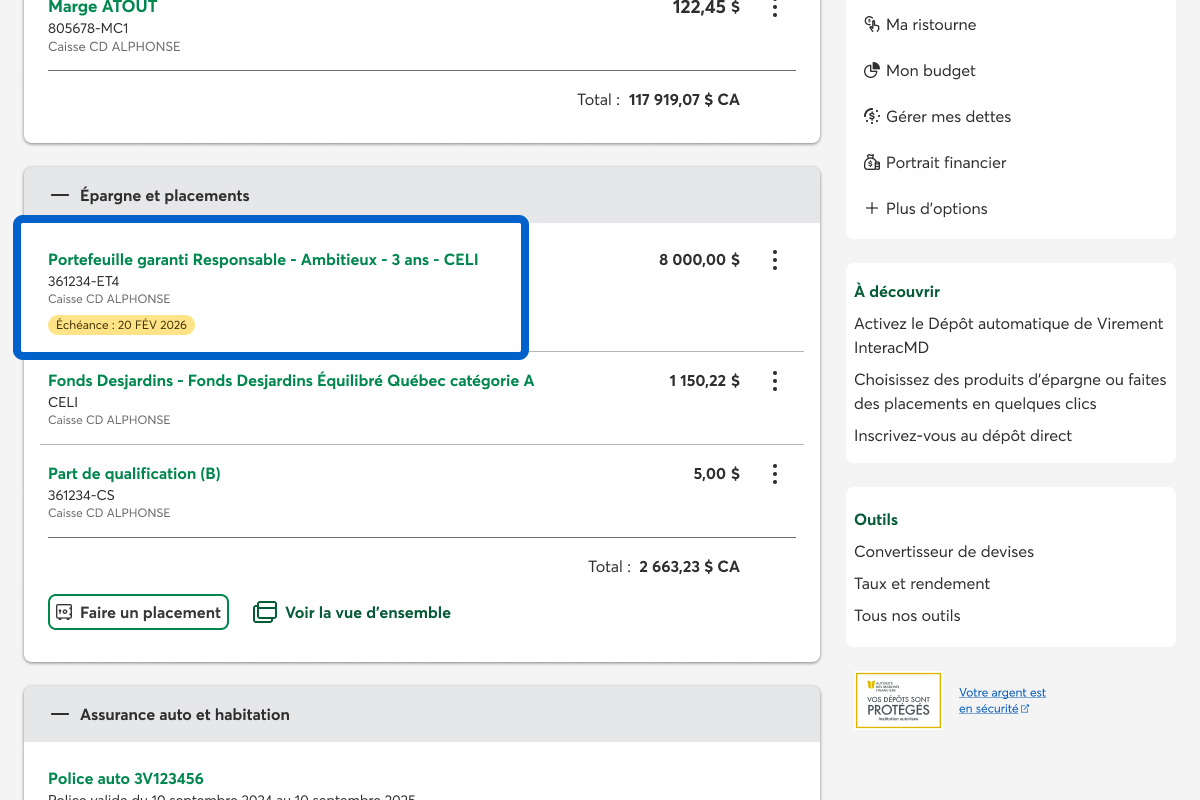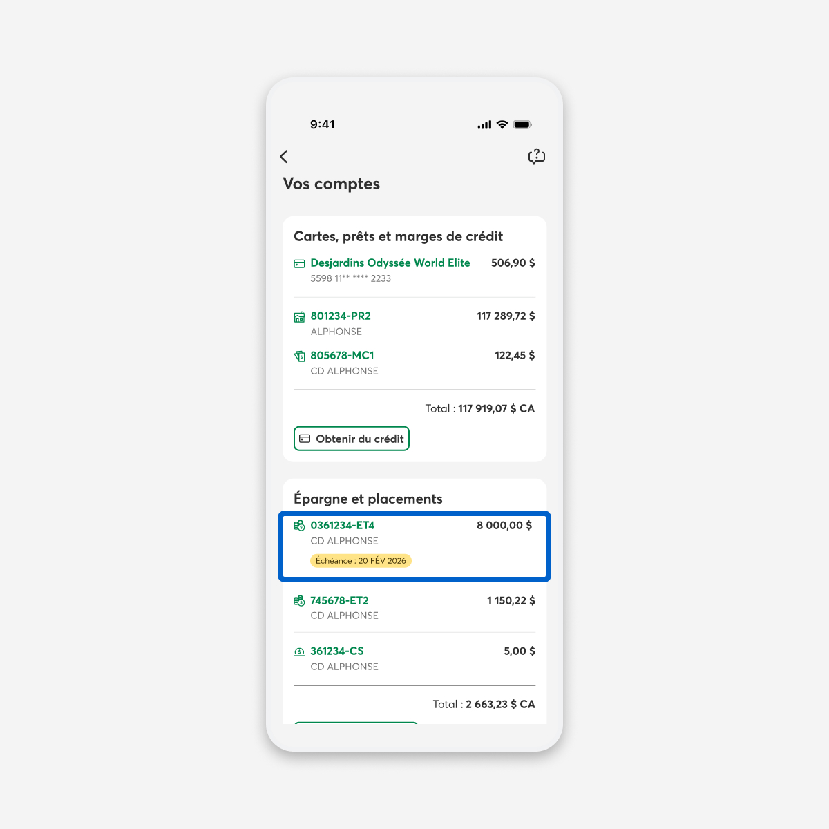 Dans la page Vos comptes, sous Épargne et placements, sélectionnez le placement garanti lié aux marchés que vous voulez renouveler.