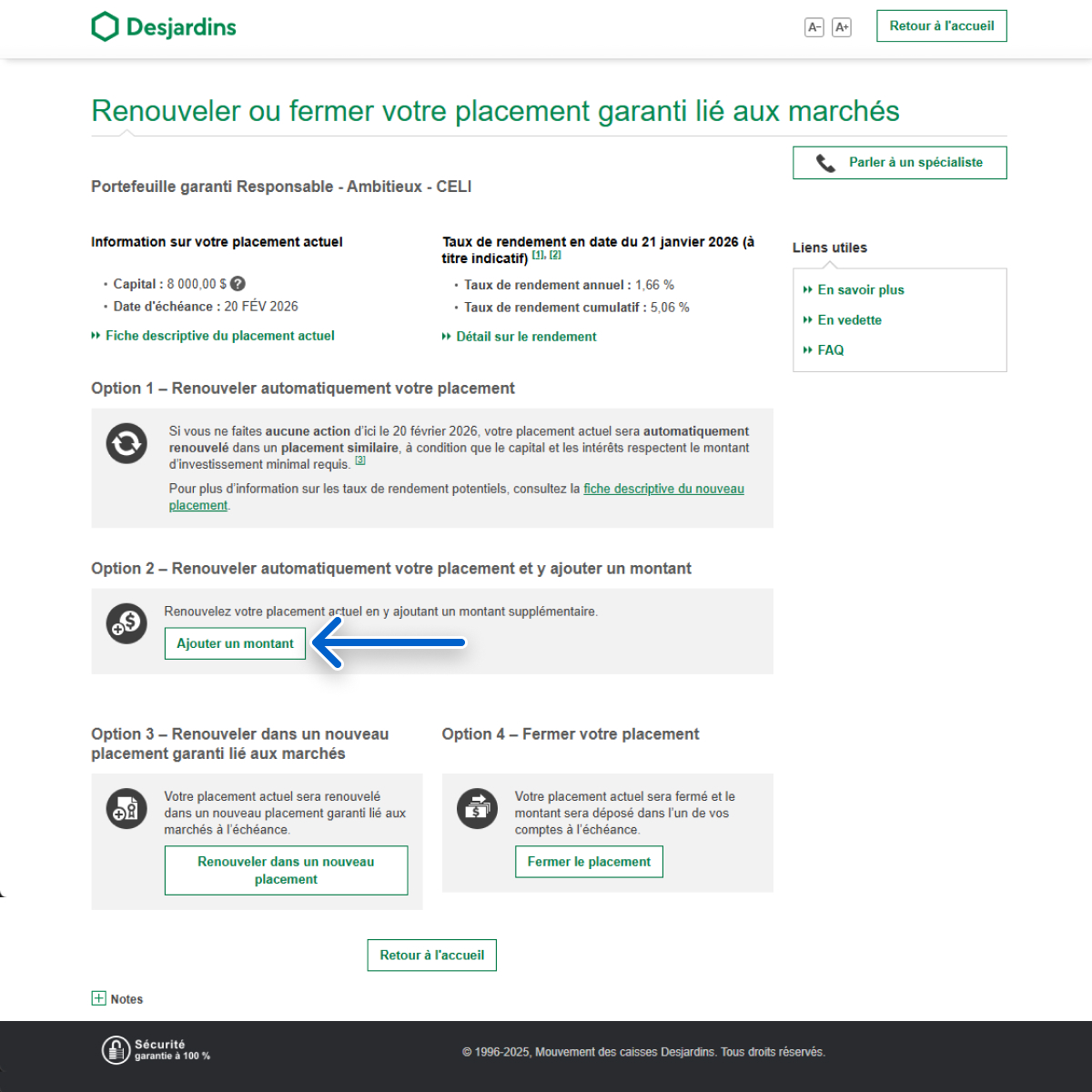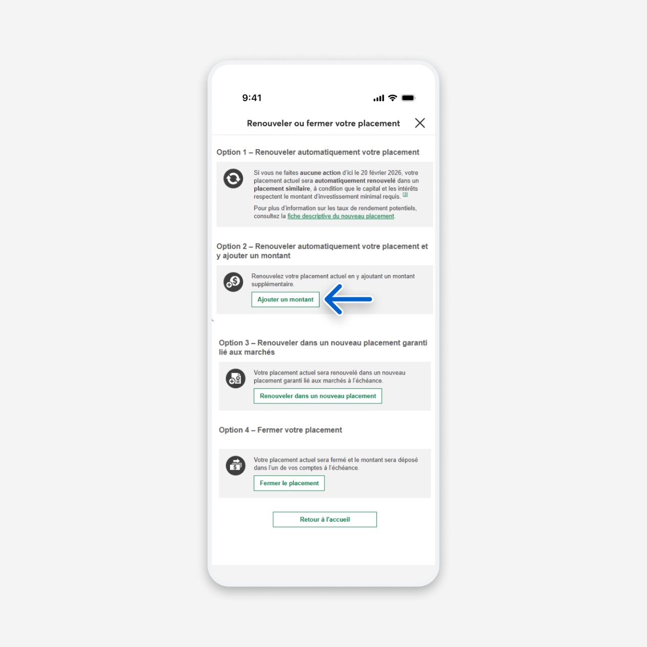 Dans la page Renouveler ou fermer votre placement garanti lié aux marchés, sous Option 2, sélectionnez le bouton Ajouter un montant.
