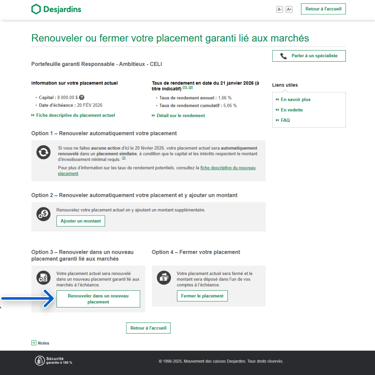 Dans la page Renouveler ou fermer votre placement garanti lié aux marchés, sous Option 3, sélectionnez le bouton Renouveler dans un nouveau placement.