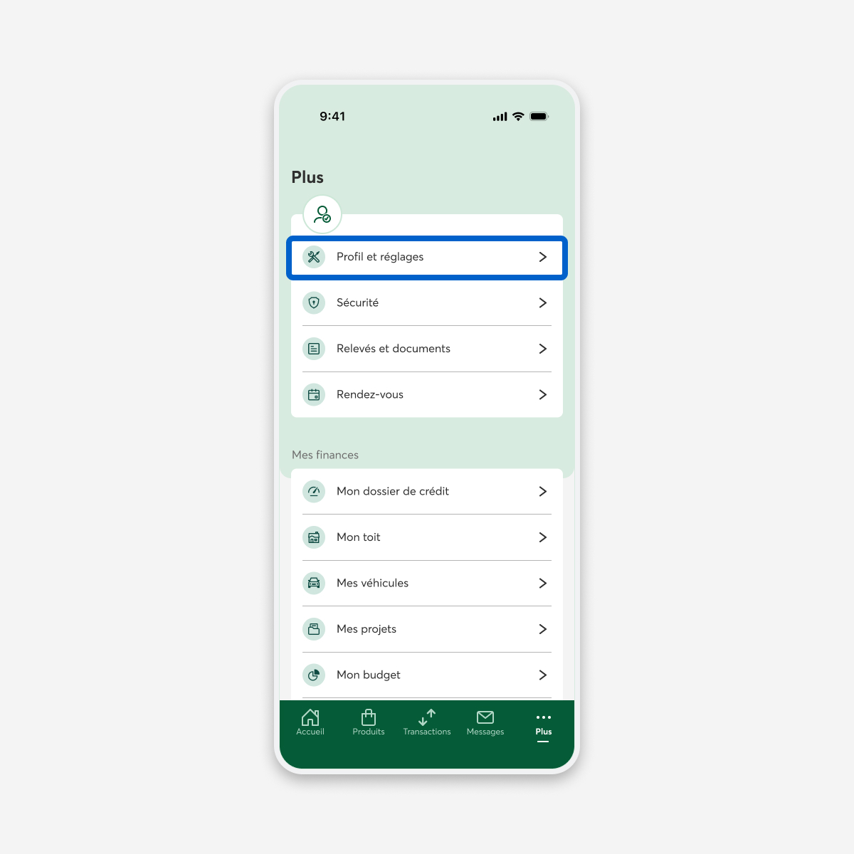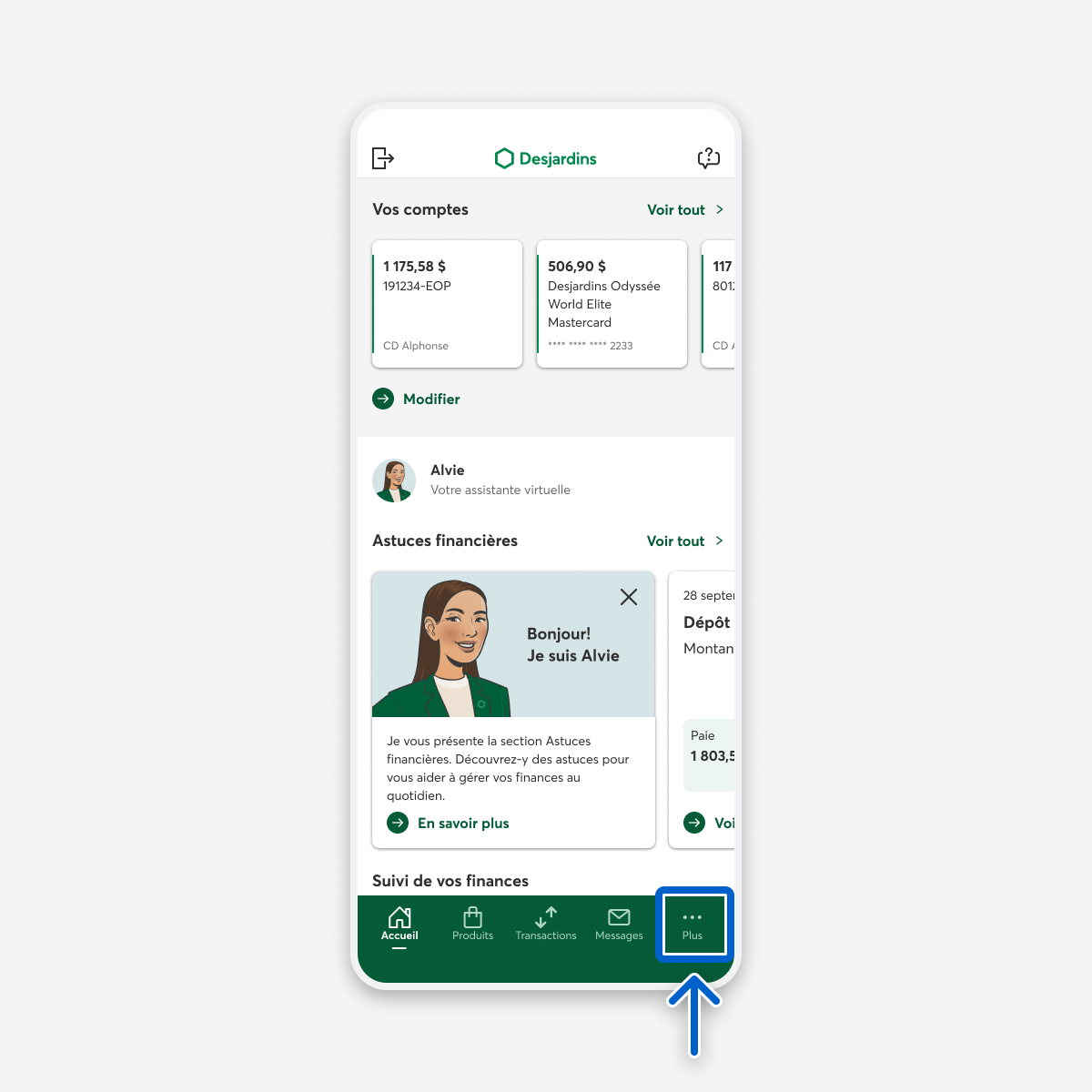 Connectez-vous à l’application Services mobiles Desjardins, puis sélectionnez l’onglet Plus.