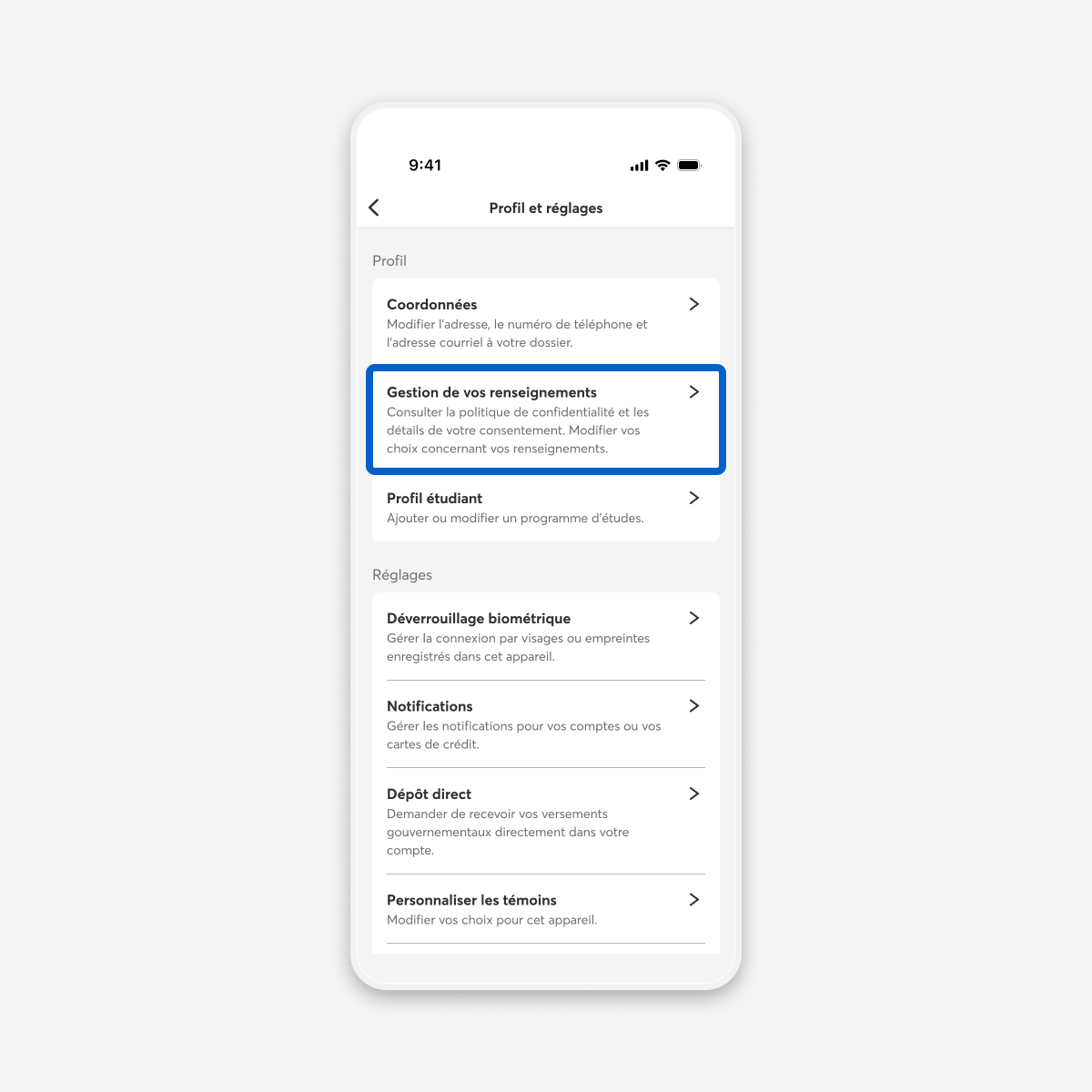 Modifiez dans AccèsD votre consentement au traitement de vos renseignements à partir de votre appareil mobile ou de votre ordinateur.