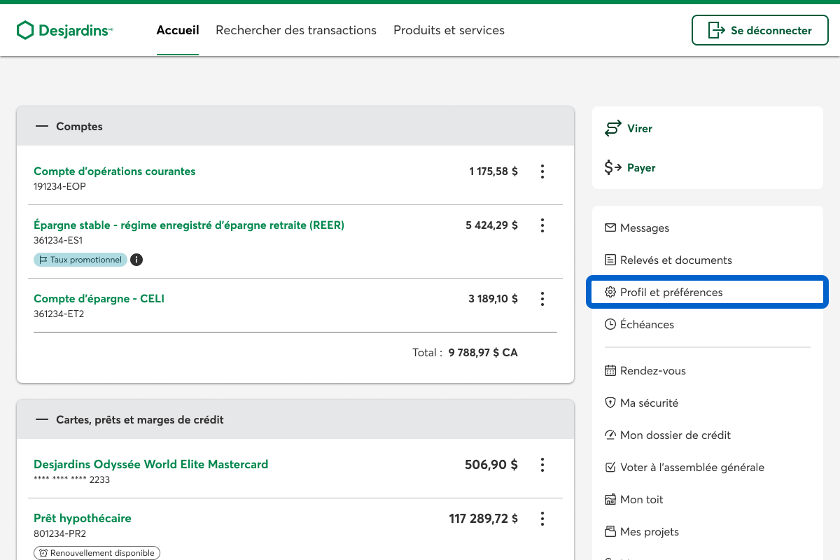 Connectez-vous à AccèsD, puis sélectionnez le bouton Profil et préférences.