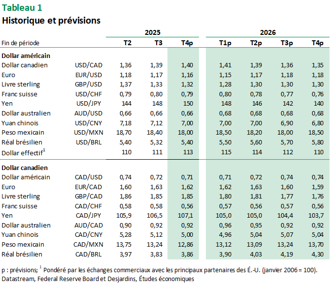 Nous avons revu nos prévisions relatives à la paire USD‑CAD. Nous nous attendons maintenant à ce que le huard se consolide au-dessus de 1,40 au cours des deux prochains trimestres. Cela reflète un élargissement modeste de l’écart de taux entre les États‑Unis et le Canada, une incertitude persistante à l’égard de la renégociation de l’ACEUM et une résilience continue de l’économie américaine. À plus long terme, nous voyons le huard se raffermir par rapport au billet vert et terminer l’année 2026 autour de 1,35 (tableau 1).