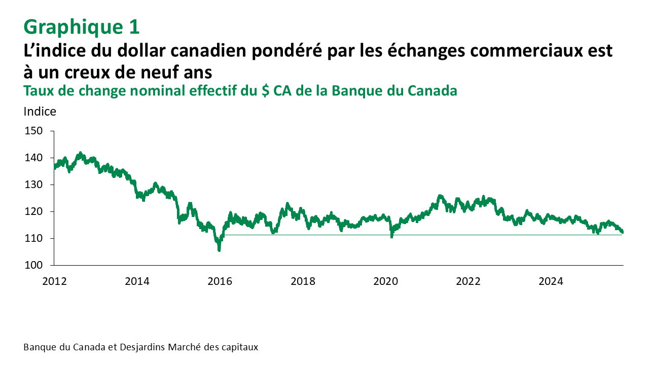 Ce n’était pas juste une affaire de dollar américain. Depuis juin, le huard a perdu du terrain relativement aux devises de la plupart des principaux partenaires commerciaux du Canada, soit 6 % par rapport au peso mexicain, 5 % par rapport à l’euro et 3 % par rapport au renminbi. L’indice TEC de la Banque du Canada, un indicateur pondéré en fonction des échanges pour le dollar canadien, s’approche de son niveau le plus bas en neuf ans (graphique 1).