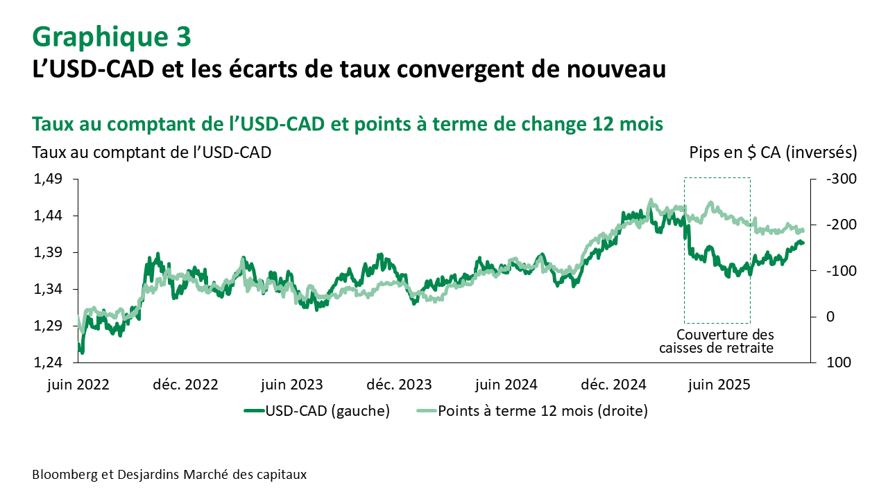 La relation historique entre le niveau des écarts de taux et l’USD‑CAD semble maintenant s’être imposée de nouveau. Une totale convergence impliquerait une paire s’établissant entre 1,40 et 1,42 (graphique 3).