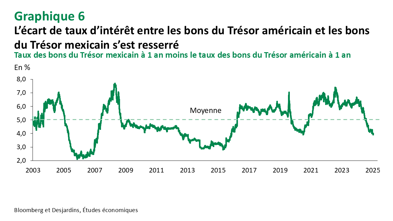 L’écart de rendement entre les bons du Trésor des États‑Unis et ceux du Mexique a diminué pour atteindre environ 4,0 %, le niveau le plus bas en 10 ans. Bien que le peso mexicain soit demeuré stable jusqu’à maintenant, nous pensons que la banque centrale sera consciente qu’un nouveau rétrécissement de l’écart pourrait exercer des pressions sur la devise mexicaine.