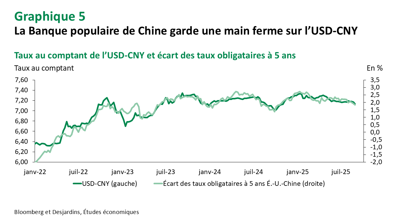 Nous nous attendons toujours à une appréciation graduelle du CNY et prévoyons que la paire USD‑CNY tombera à 7,00 d’ici la fin de 2025 et à 6,80 d’ici la fin de 2026.
