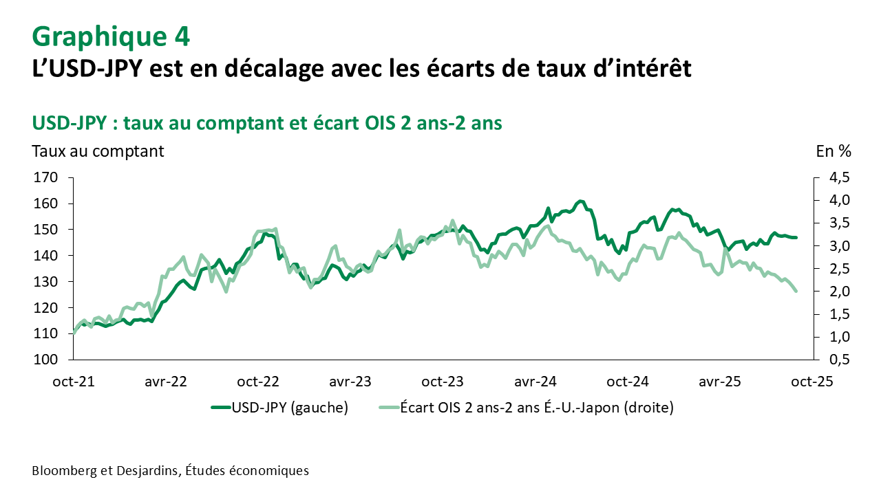 Nous entrevoyons un potentiel de recul marqué de l’USD‑JPY si le sentiment à l’égard du risque se détériore et que les investisseurs à effet de levier commencent à fermer leurs positions vendeurs sur le yen. Notre prévision pour la fin de 2025 demeure à 145, mais les risques sont, selon nous, orientés à la baisse.