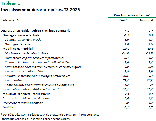 - Les améliorations de la rentabilité ne se sont toutefois pas traduites par une hausse de l’investissement des entreprises dans l’ensemble. L’investissement réel des entreprises en structures non résidentielles ainsi qu’en machines et matériel a reculé de 4,5 % (rythme trimestriel annualisé) au troisième trimestre (graphique 2 et tableau 1). Seuls les ouvrages de génie ont enregistré une hausse (+1,0 %), tandis que toutes les catégories de machines et matériel ont affiché des baisses, à l’exception des automobiles. Les dépenses des entreprises en produits de propriété intellectuelle ont également diminué, y compris en R‑D (qui avait pourtant augmenté au premier semestre).