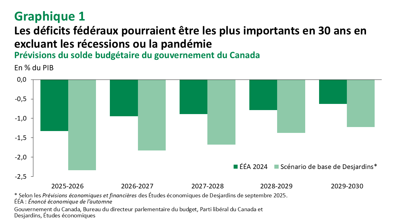- Après un long retard, le budget fédéral 2025 sera finalement déposé le 4 novembre. S’il est difficile de prévoir l’ampleur exacte des déficits prévus, les dépenses et les réductions d’impôt annoncées depuis les élections indiquent clairement qu’ils seront parmi les plus importants de l’histoire récente en proportion du PIB en excluant les récessions ou la pandémie (graphique 1).