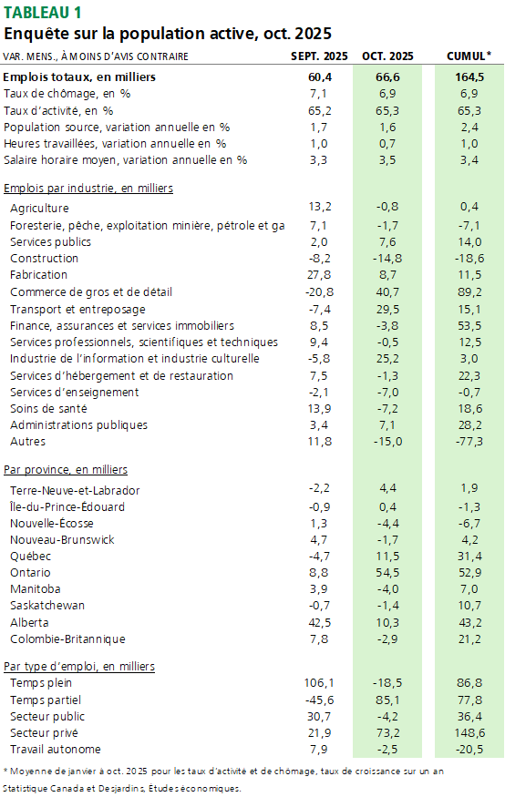 - L’emploi au Canada a augmenté de 66 600 postes en octobre, un résultat supérieur aux attentes des prévisionnistes, qui anticipaient une baisse de 5 000. Le taux de chômage a reculé de deux dixièmes pour s’établir à 6,9 %.