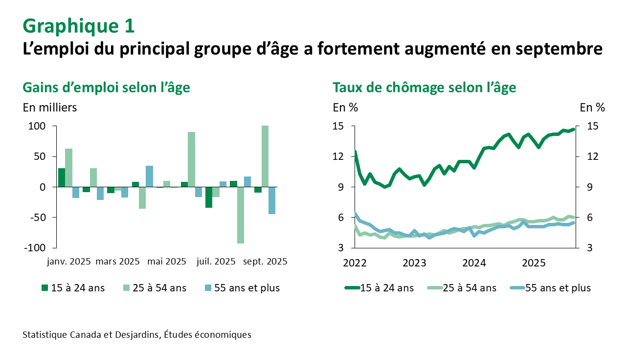 Malgré ces résultats, le portrait du marché du travail demeure contrasté, le taux de chômage étant resté stable. Chez les travailleurs âgés de 25 à 54 ans, ce taux a légèrement reculé, passant de 6,1 % à 6,0 % en septembre (graphique 1). Cette baisse s’explique par une forte création d’emplois dans cette tranche d’âge, avec un gain net de 109 000 postes, surpassant les pertes de 93 000 enregistrées en août. À l’inverse, les jeunes de 15 à 24 ans ont perdu environ 9 000 emplois, en partie à la suite de la fin des emplois estivaux. Le taux de chômage chez les jeunes a grimpé à 14,7 %, son niveau le plus élevé depuis septembre 2010, en excluant la période pandémique. Notre rapport récent Lien externe au site. examinait les facteurs à l’origine de ce taux élevé, dont certains commencent à s’atténuer.
