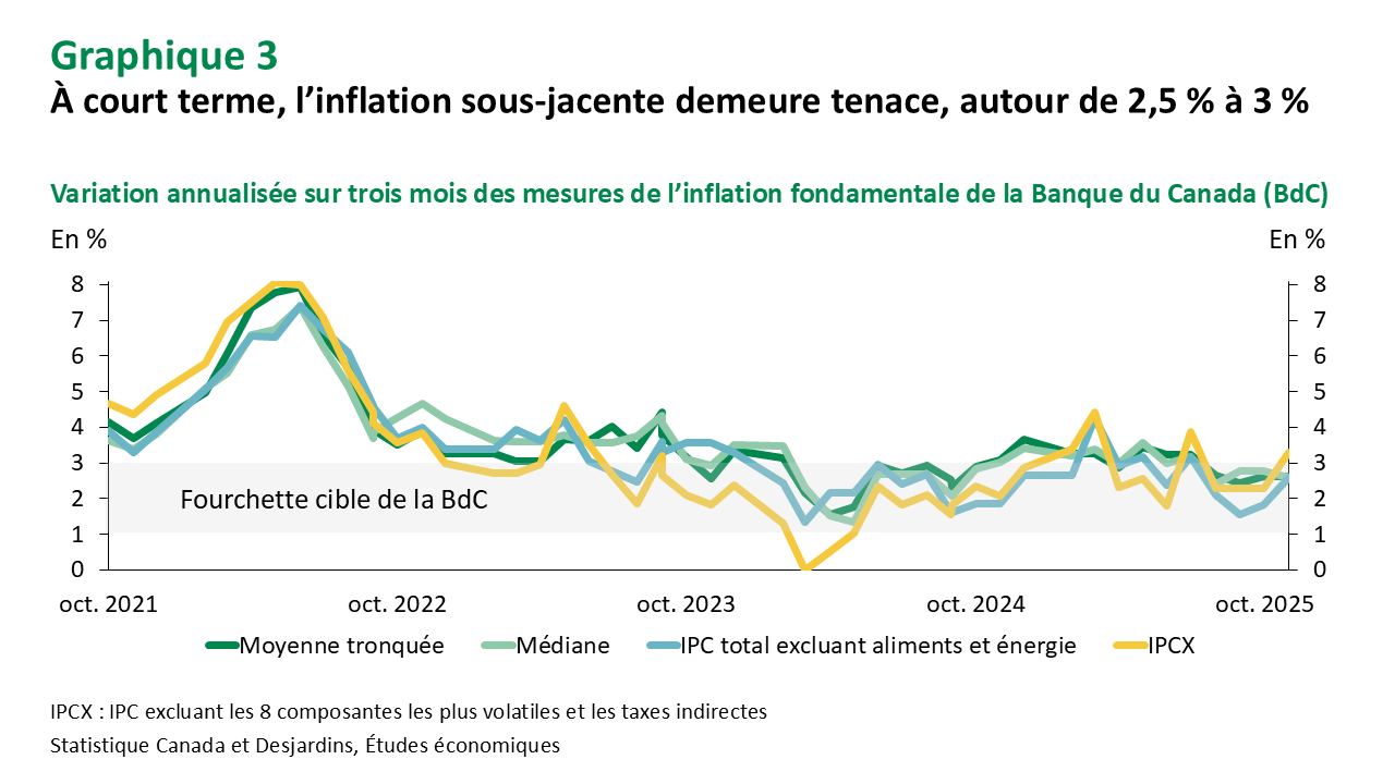 En ce qui concerne l’inflation sous-jacente, les mesures privilégiées par la BdC – l’IPC médian et la moyenne tronquée – ont légèrement ralenti en octobre pour s’établir autour de 3,0 % sur un an. À l’inverse, les mesures plus traditionnelles ‒ l’IPC excluant les aliments et l’énergie et l’IPC excluant les huit composantes les plus volatiles – ont légèrement progressé pour se situer entre 2,7 % et 2,9 %. Plus préoccupante, la moyenne mobile désaisonnalisée sur trois mois de ces dernières séries a fortement accéléré, passant de 2,1 % en septembre à 3,0 % en octobre (graphique 3). Cependant, la même mesure appliquée aux indicateurs privilégiés par la BdC est passée de 2,7 % à 2,6 % le mois dernier. Selon d’autres indicateurs récemment mis de l’avant par la BdC, rien n’indique que l’inflation sous-jacente se soit écartée de son estimation récente de 2,5 %.