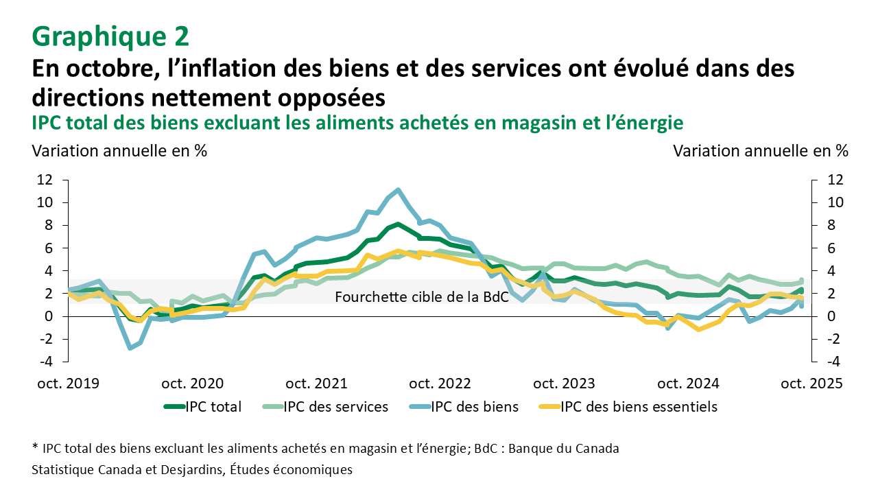 Outre l’énergie, certaines autres composantes ont affiché des variations notables. Les prix des aliments achetés en magasin ont ralenti à 3,4 % en octobre, contre 4,0 % en septembre, contribuant à modérer l’inflation. Cette évolution pourrait refléter la réduction importante des droits de douane sur les importations en provenance des États‑Unis par le gouvernement fédéral, ce qui devrait continuer à se faire sentir sur l’inflation à mesure que l’effet des tarifs plus bas se répercute sur les prix à la consommation. Toutefois, tout n’était pas positif dans la publication de ce matin. L’inflation des services a augmenté de quelques points de base pour atteindre 3,2 % (graphique 2), en raison de hausses marquées des prix des assurances habitation et automobile, ainsi que de la première augmentation du coût des services cellulaires depuis avril 2023. Les taxes foncières ont également progressé de 5,6 % sur un an, après une hausse de 6,0 % en octobre 2024, tandis que l’inflation des loyers a connu une accélération notable (de 4,8 % à 5,2 %).