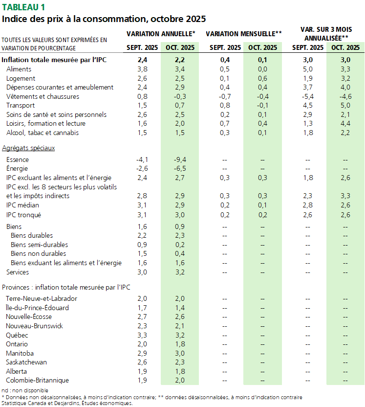 - L’indice des prix à la consommation (IPC) global a progressé de 2,2 % en glissement annuel en octobre, en baisse par rapport à 2,4 % en septembre et légèrement au-dessus des attentes du consensus (2,1 %). Les prix ont augmenté de 0,2 % d’un mois à l’autre et de 0,1 % après ajustement pour les effets saisonniers. Le tableau 1 résume les principaux indicateurs.