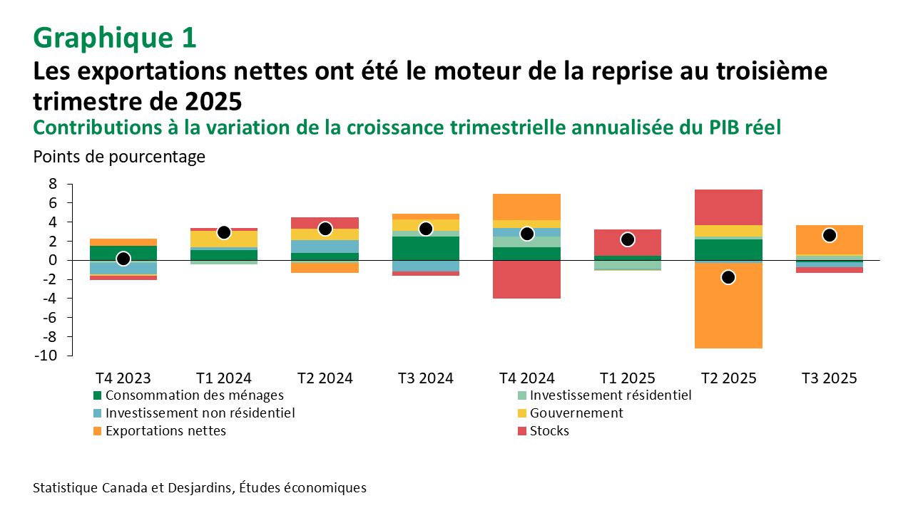 La forte reprise de la croissance du PIB réel au troisième trimestre 2025 a été principalement attribuable à une amélioration notable des exportations nettes (graphique 1). Toutefois, le redressement des échanges commerciaux découle surtout d’une baisse marquée des importations, qui ont enregistré leur plus fort recul depuis 2022 (–8,6 %, taux annualisé). Cette diminution s’explique par la chute des importations de métaux précieux et de machines industrielles, ces dernières étant liées à l’importation ponctuelle d’un important module pétrolier et gazier au trimestre précédent. Les exportations ont légèrement progressé après une forte baisse au deuxième trimestre, en hausse de 0,7 % (taux annualisé), grâce à la vigueur des exportations de produits pétroliers et de services commerciaux.