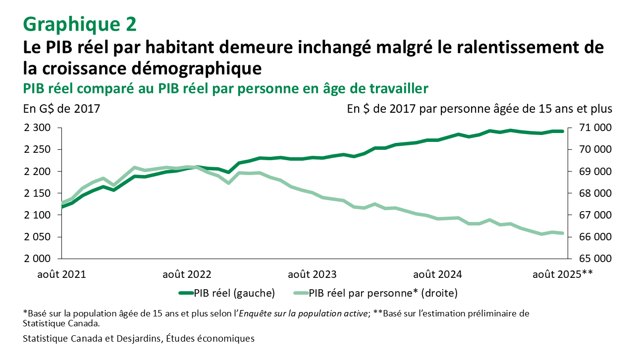 Malgré cette vigueur mensuelle, le PIB par habitant ne montre toujours pas de signes de retour à sa trajectoire prépandémique, et ce, même si la croissance démographique ralentit (graphique 2). L’immigration et les admissions de résidents non permanents ne sont en baisse que depuis quelques trimestres – une période trop courte pour avoir un effet significatif sur les indicateurs par habitant – tandis que les tensions commerciales ont freiné les exportations, entraînant une contraction du PIB au deuxième trimestre.