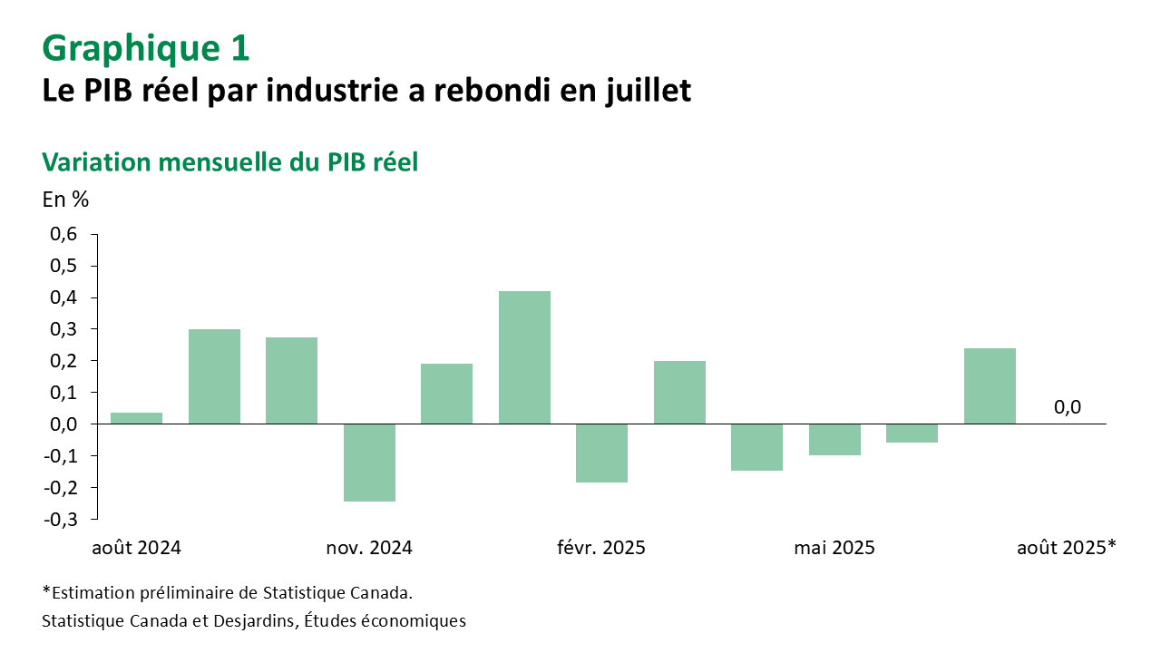 - L’estimation préliminaire de Statistique Canada indique que le PIB réel est demeuré pratiquement inchangé en août (graphique 1).