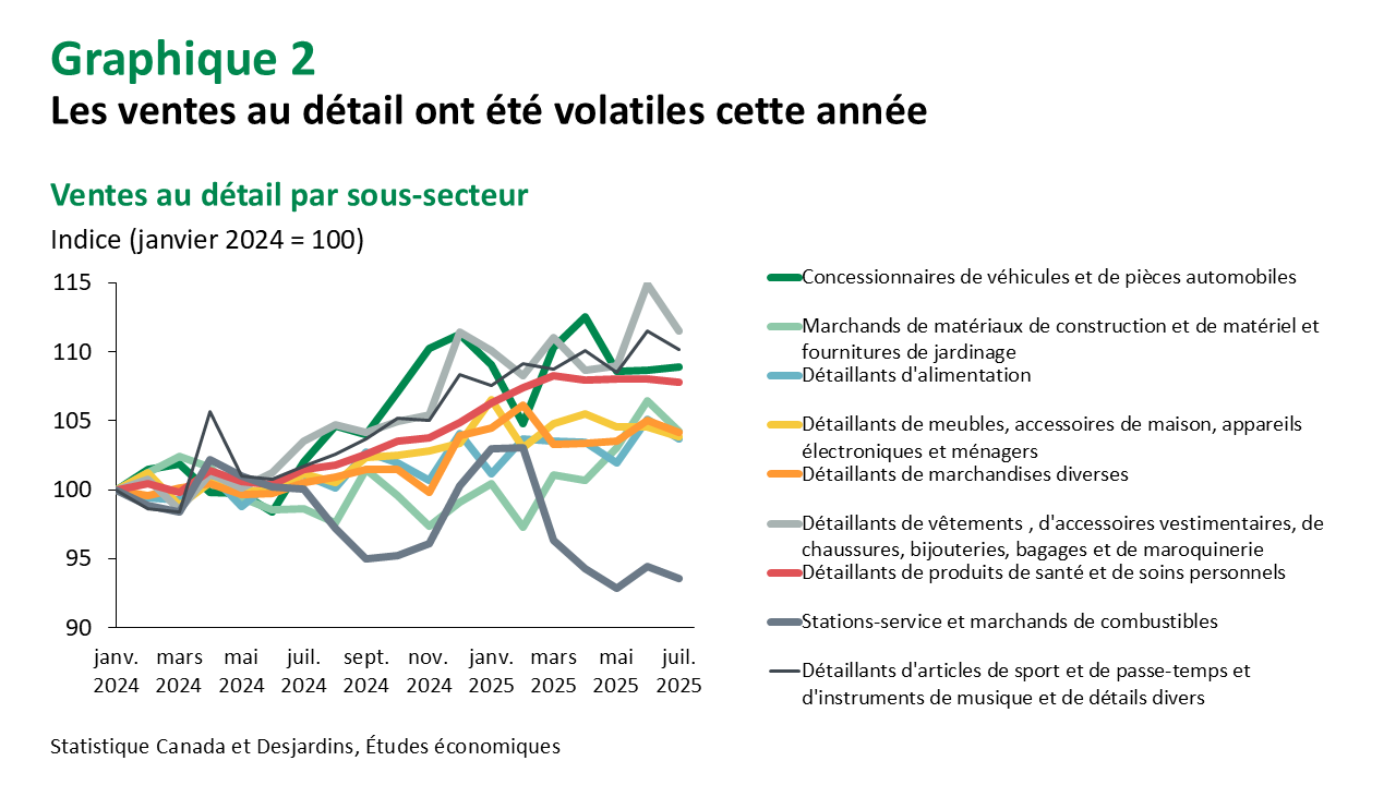 Le recul généralisé des ventes au détail en juillet n’est pas entièrement surprenant dans le contexte économique actuel, marqué par l’incertitude commerciale et une confiance des consommateurs en demi-teinte. Toutefois, ce résultat doit être mis en perspective avec les solides gains enregistrés en juin et vraisemblablement en août. En effet, les ventes au détail ont affiché une forte volatilité mensuelle depuis le début de l’année (graphique 2). La tendance plus préoccupante concerne les ventes au détail de base, qui ont diminué trois fois au cours des quatre derniers mois. Le dynamisme du secteur automobile semble également s’être essoufflé depuis le mois de mai. Au cours des prochains mois, la croissance plus lente de la population, la faiblesse du marché de l’emploi et la situation financière serrée des ménages risquent de freiner la progression des ventes au détail.
