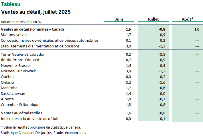 - Cinq provinces ont connu une baisse des ventes, notamment l’Ontario et Terre‑Neuve-et‑Labrador. Dans ce dernier cas, les feux de forêt survenus en juillet pourraient avoir contribué à la faiblesse observée. Au Québec, les ventes ont légèrement progressé (+0,2 %).