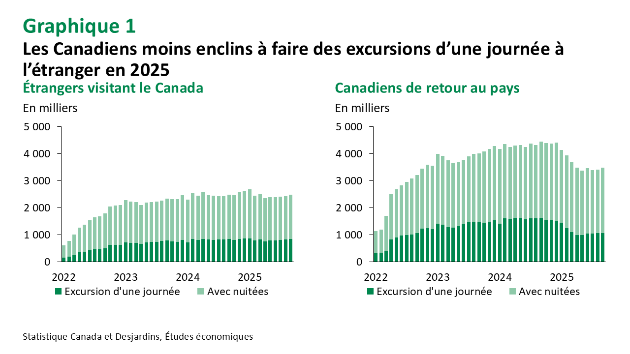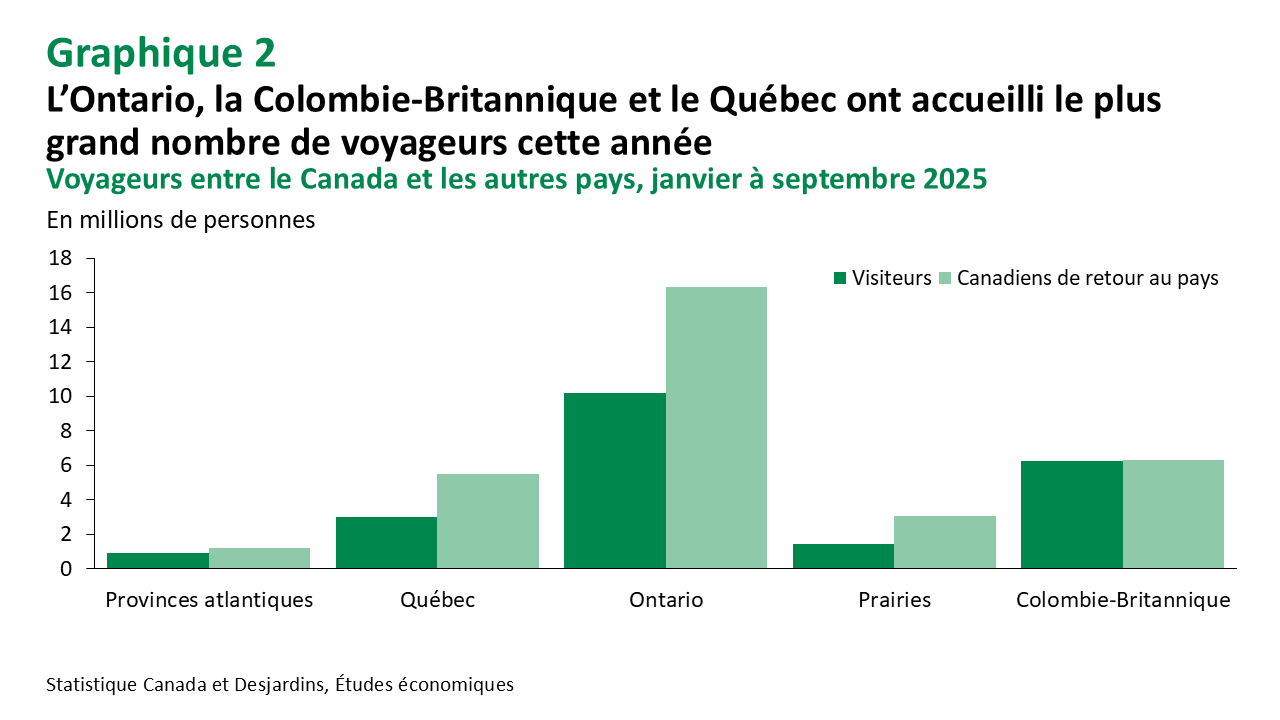 La baisse persistante des déplacements transfrontaliers comporte des conséquences économiques nuancées. Pour le secteur touristique canadien, la diminution des voyages à l’étranger pourrait rediriger les dépenses vers des destinations touristiques locales, ce qui profiterait aux secteurs de l’hébergement et du commerce de détail, notamment dans les régions qui perdent habituellement des dépenses au profit des villes frontalières américaines. Bien que les données sur le tourisme intérieur soient limitées, les informations disponibles vont dans ce sens. Par exemple, l’emploi et la production dans les secteurs liés au tourisme étaient nettement plus élevés qu’un an plus tôt jusqu’en août. Des données sectorielles plus localisées indiquent une tendance similaire. À l’inverse, même un léger recul des visiteurs américains au Canada pourrait peser sur les communautés dépendantes du tourisme, particulièrement en Ontario et en Colombie‑Britannique, qui attirent le plus de visiteurs américains. Cependant, jusqu’à présent, cela ne semble pas contrebalancer l’élan positif provenant des voyages intérieurs et des visites en provenance de l’étranger.
