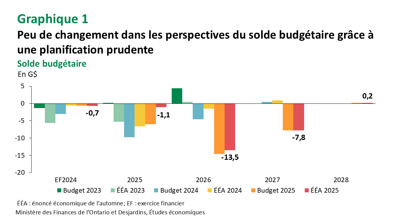 - Le gouvernement de l’Ontario a privilégié la prudence dans son énoncé économique de l’automne 2025 (ÉÉA 2025), maintenant les perspectives de déficit largement conformes aux prévisions du budget 2025 (graphique 1).