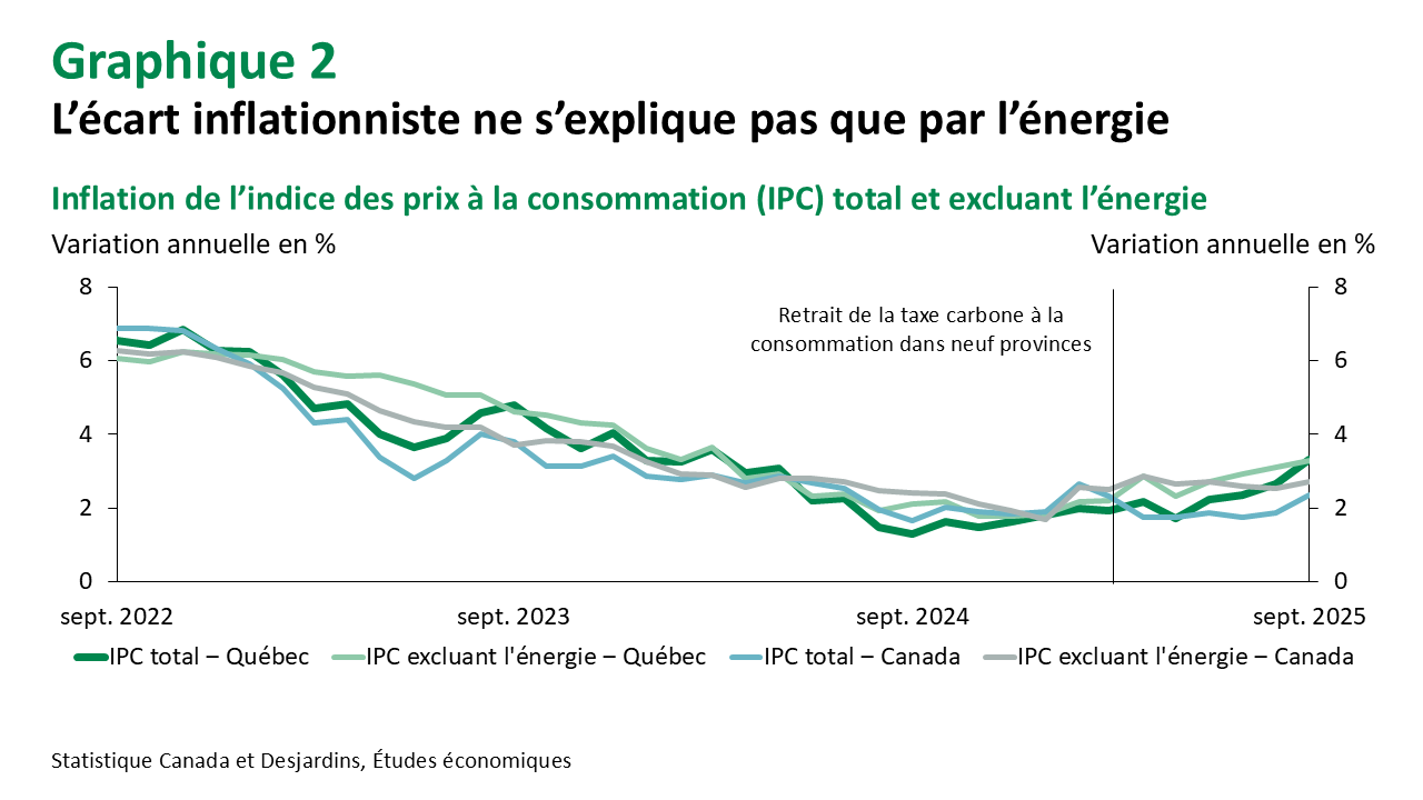 Avec des effets de base persistants sur le marché locatif et le maintien de la tarification du carbone, l’inflation québécoise devrait rester supérieure à la moyenne nationale jusqu’au milieu de 2026. Toutefois, au-delà de ces facteurs, les pressions sous-jacentes, soit celles qui orientent la politique monétaire, demeurent comparables à celles du reste du pays.