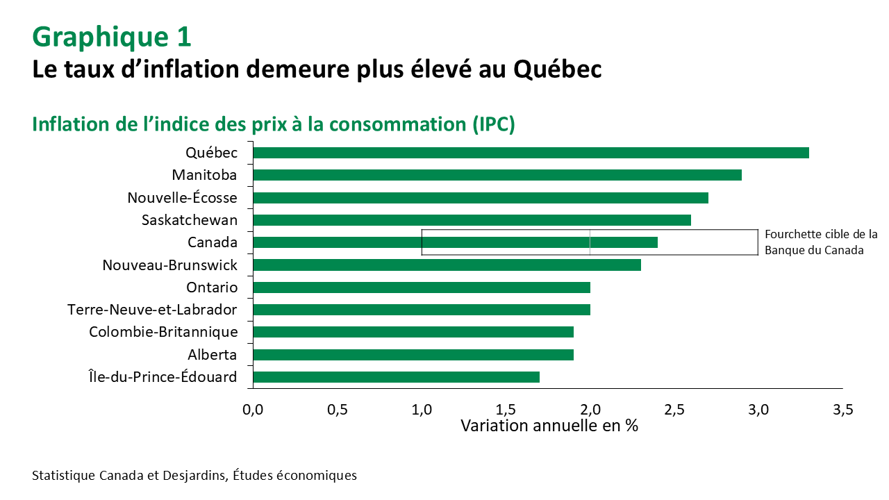 - Ce rythme est près de 1 point de pourcentage supérieur à celui de l’ensemble du Canada, où l’inflation s’est établie à 2,4 % (voir notre analyse Lien externe au site. publiée aujourd’hui), également en hausse par rapport à 1,9 % en août.