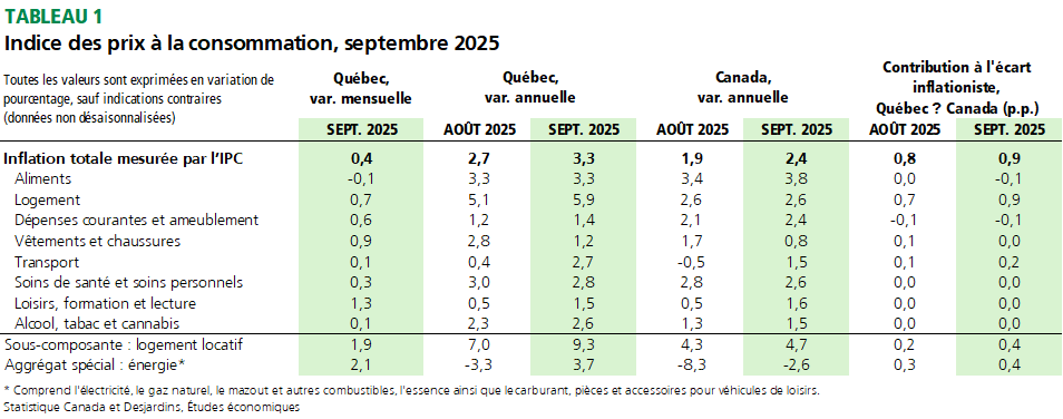- Au Québec, l’indice des prix à la consommation (IPC) a progressé de 3,3 % en glissement annuel en septembre, accélérant par rapport à la hausse de 2,7 % observée en août.
