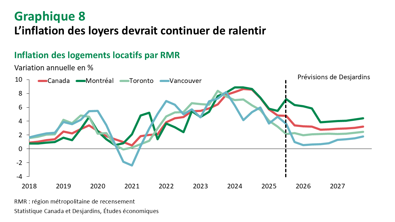Pour ces raisons, un meilleur équilibre est attendu sur le marché locatif au Québec, ce qui devrait atténuer la hausse des loyers. Un certain ralentissement du rythme de croissance des loyers moyens demandés est déjà visible, surtout à Montréal, en raison de la croissance démographique plus lente et de l’offre locative accrue. Ce ralentissement est bienvenu puisque la divergence entre les loyers et les revenus a continué de s’amplifier dans la dernière année (graphique 7). La croissance des loyers devrait continuer de ralentir Lien externe au site. jusqu’au milieu de 2026, avant de s’accélérer graduellement à mesure que la demande reprendra de la vigueur et que l’offre de nouveaux logements sera réduite en raison des difficultés liées aux coûts et à la réglementation. Les mesures de contrôle des loyers adoptées par le Tribunal administratif du logement (TAL) affecteront aussi le rythme de croissance de ceux-ci dans toute la province et expliquent en partie l’augmentation de loyer un peu plus forte attendue à Montréal (graphique 8). Bien que les lignes directrices du TAL pour 2026 soient toujours attendues, la modification de la formule devrait entraîner des hausses moindres à l’avenir.