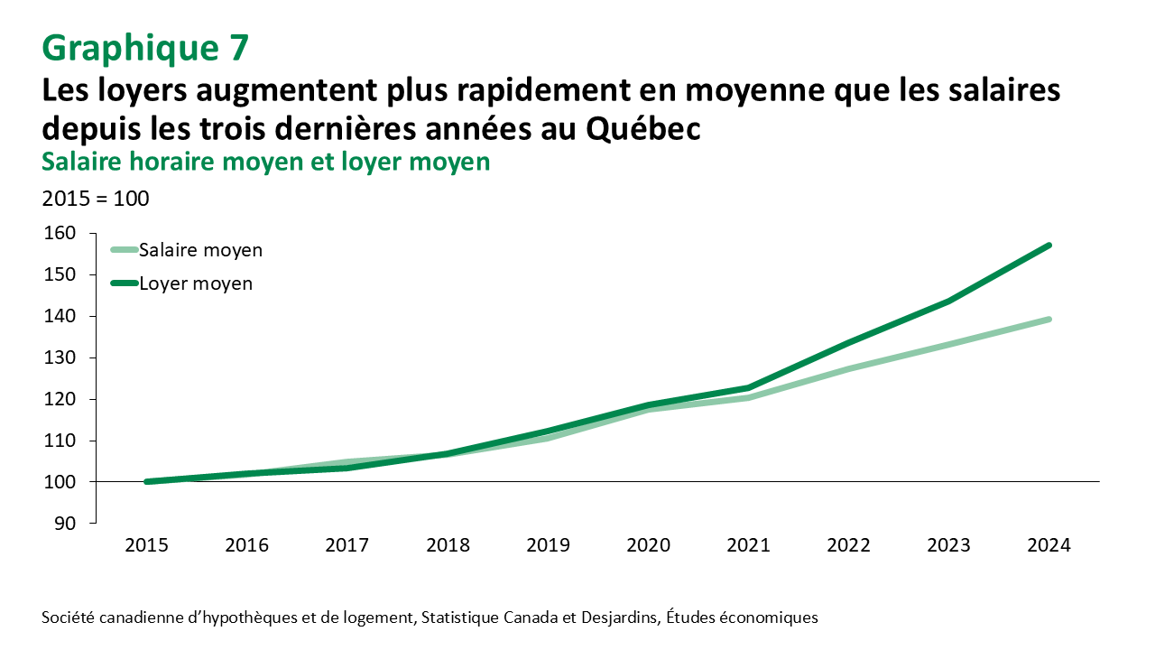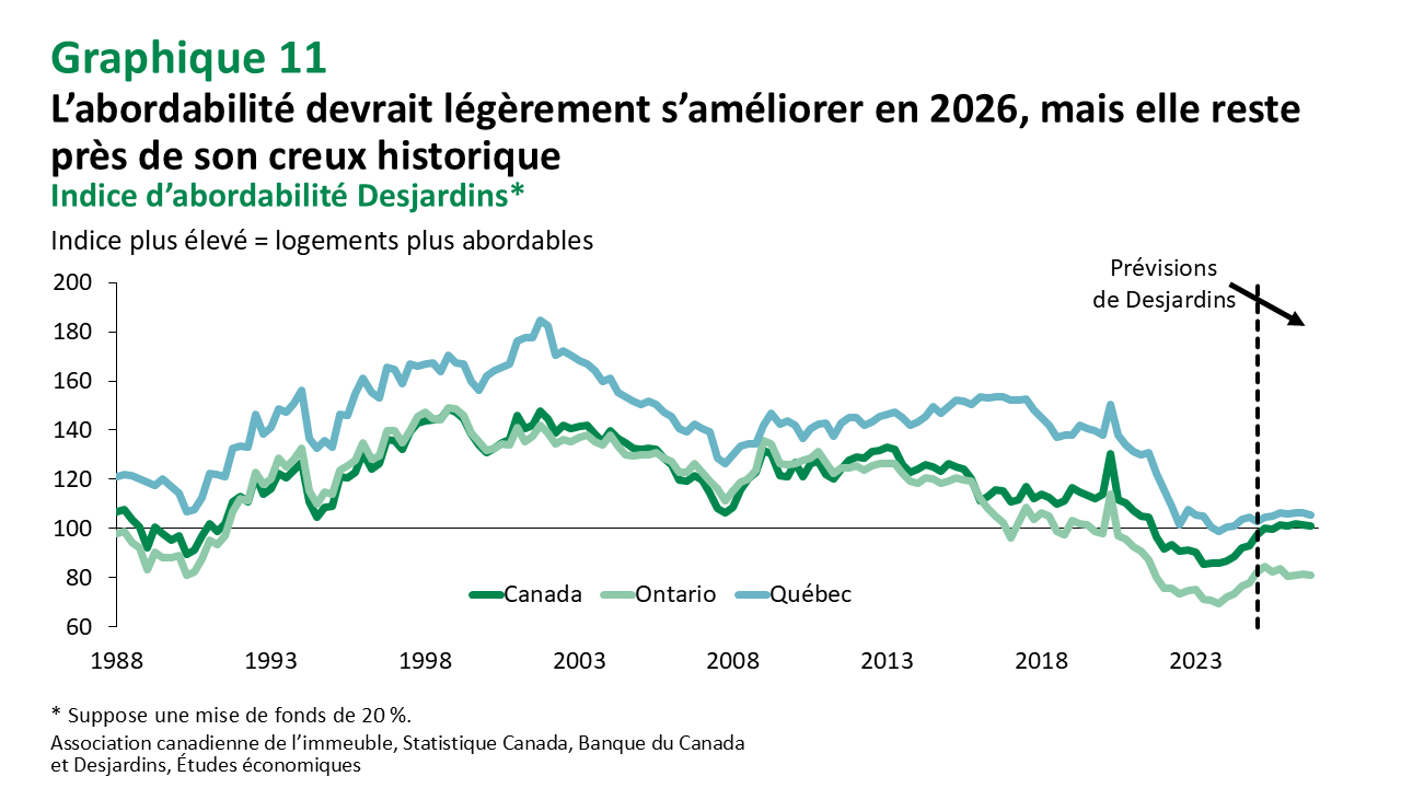 Un ralentissement de la demande était attendu en début d’année 2025 en raison de la baisse du niveau de confiance chez les consommateurs découlant du conflit commercial avec les États‑Unis. Au Québec, le conflit commercial semble toutefois avoir moins lourdement pesé sur les acheteurs potentiels au cours de la dernière année qu’ailleurs au pays, puisque les ventes de propriétés ont réussi à maintenir leur élan. Le nombre de transactions continue d’augmenter et, bien que les nouvelles inscriptions soient aussi plus nombreuses, la forte demande met encore de la pression sur les prix. Malgré la baisse des taux hypothécaires, l’abordabilité demeure faible.
