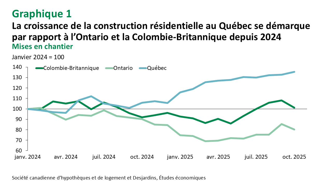 C’est sans aucun doute la construction résidentielle qui s’est montrée la plus résiliente au Québec depuis le début de l’année. Celle-ci est en forte hausse dans la province jusqu’à présent en 2025, avec une augmentation de 26 % des mises en chantier lors des trois premiers trimestres par rapport au même moment en 2024. Cette croissance contraste avec celle des autres provinces, alors que la moyenne nationale se situe à 6,0 % pour cette période et à 1,4 % si l’on exclut le Québec. Bien que les mises en chantier semblent augmenter à nouveau en Ontario et en Colombie‑Britannique, leur retard accumulé par rapport au Québec en matière de construction résidentielle fait que l’écart reste assez élevé (graphique 1).
