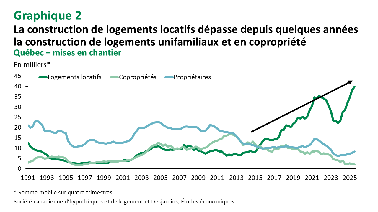 L’augmentation de l’offre devrait permettre d’atténuer un peu la pression sur les prix, mais l’abordabilité demeure toutefois très faible. Les mises en chantier sont concentrées dans le marché locatif et seulement 20 % des nouvelles unités construites depuis le début de l’année 2025 sont destinés à la propriété. La hausse de l’offre sur ce marché précisément ne se fait donc pas aussi rapidement que sur celui des appartements destinés à la location. De plus, les logements recherchés par plusieurs premiers acheteurs tels que ceux dans les duplex, les triplex ou les maisons en rangée, qui sont généralement plus grands qu’un logement en copropriété dans une tour d’habitation, se font de plus en plus rares. Les mises en chantier pour ce segment de marché sont peu nombreuses, l’offre demeure faible, ce qui pousse les prix vers le haut. L’accès à la propriété demeure donc assez difficile pour plusieurs acheteurs potentiels.