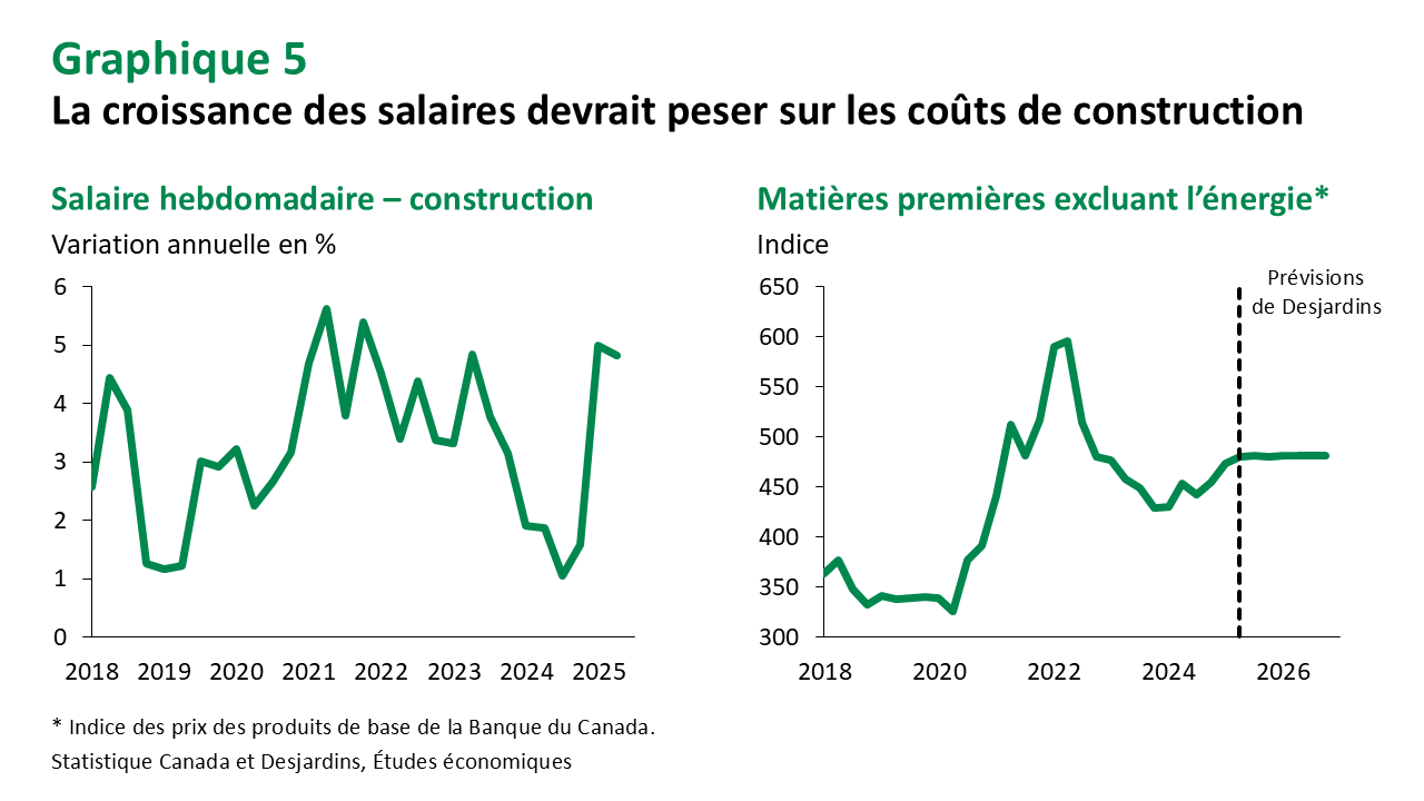Les coûts de construction élevés Lien externe au site. pourraient aussi contribuer au ralentissement de l’activité. La hausse des salaires, soutenue par une forte demande de main-d’œuvre et par le renouvellement des conventions collectives, explique en partie la récente envolée observée au Québec (graphique 5). Malgré de légères baisses attendues des coûts des matériaux, les salaires et la concurrence pour les ressources nécessaires à la construction maintiendront les coûts élevés. Nous prévoyons une progression de l’indice des prix de la construction de bâtiments (IPCB) résidentiels d’environ 2 % d’ici la fin de 2025 et de 5 % en 2026 (graphique 6).