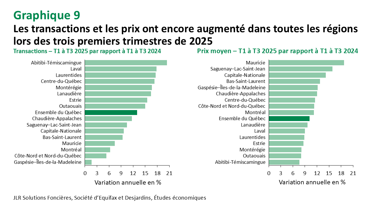 Les transactions et les prix de vente progressent dans l’ensemble des régions du Québec. Les stocks se redressent graduellement dans la plupart des endroits, mais les hausses de prix sont plus marquées dans les régions où ce rééquilibrage tarde, comme en Mauricie, dans la Capitale‑Nationale ou au Saguenay–Lac‑Saint‑Jean (graphique 9).